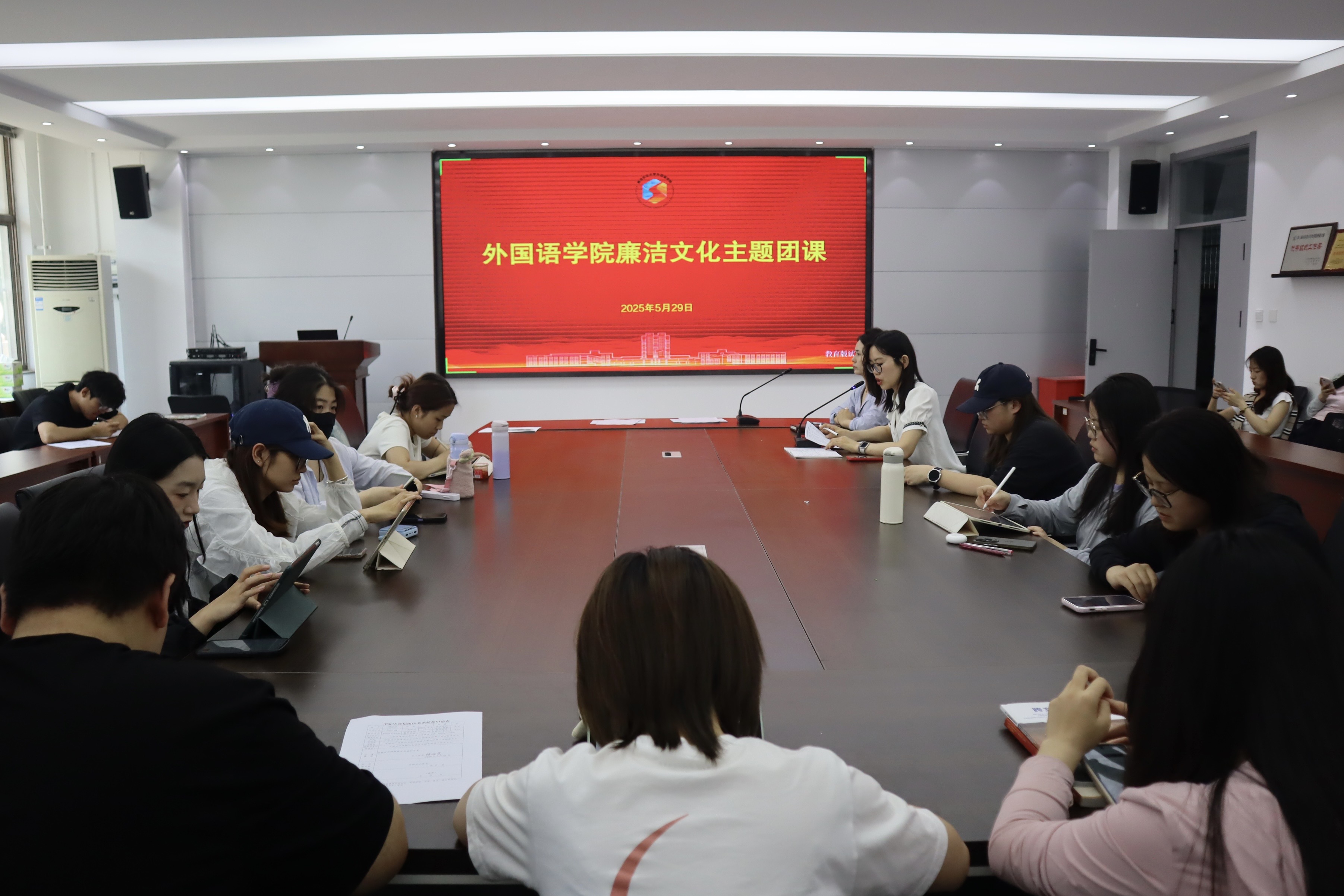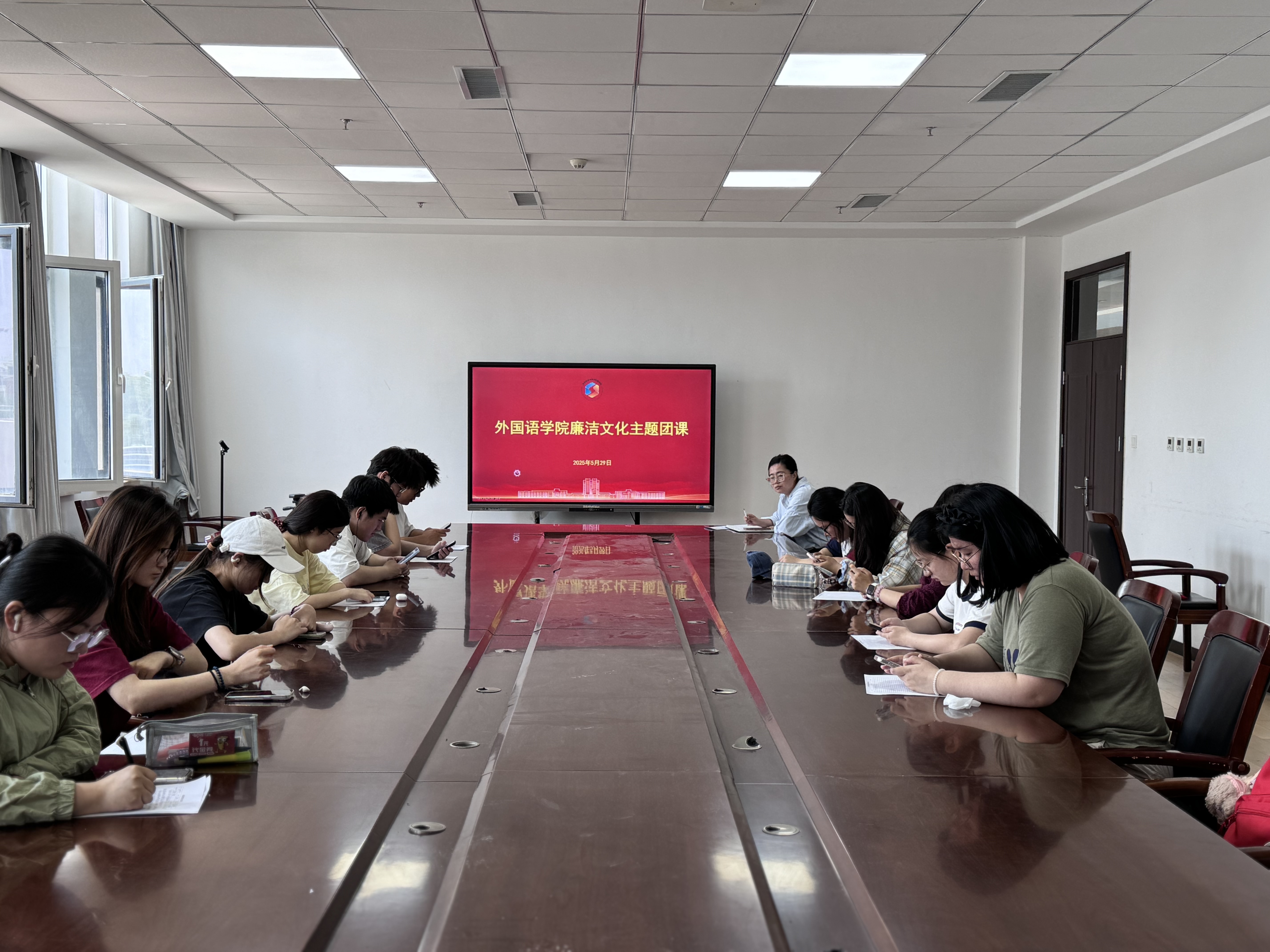 5月29日,外国语学院团委书记线郁在平度校区大学生活动中心201会议室讲授廉洁文化主题团课,辅导员仇文峰、邹晓婷及全体学生骨干线上线下参加。