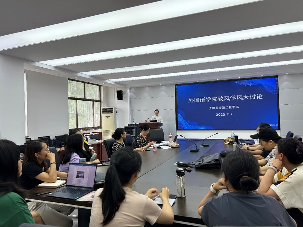 为积极响应学校关于开展“教风学风大讨论”的号召,深化新时代大学英语教学改革,切实提升育人质量与教学实效,大学英语第二教学部于7月7日下午在文经楼C220举办专题研讨活动。本次研讨以“深入开展教风学风大讨论,聚焦AI赋能教学新路径”为主题,由教学部主任聂庆娟主持,全体教师参加。