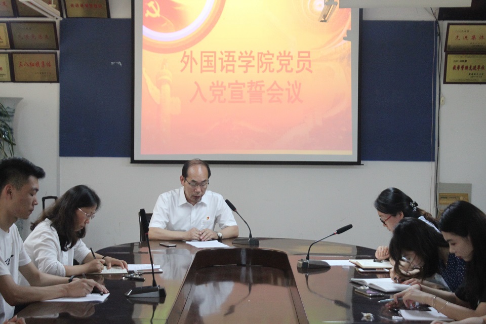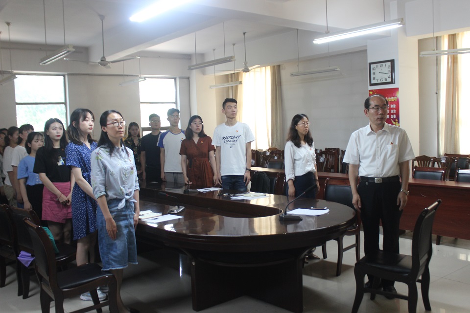 7月1日,sunbet申搏官方网站外国语学院在文经楼会议室举行党员宣誓仪式。学院党委书记王仁高、团委书记嵇安奕、正科级辅导员刘艳出席,全体学生党员参加。仪式由嵇安奕主持。
