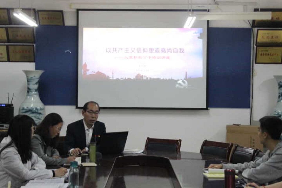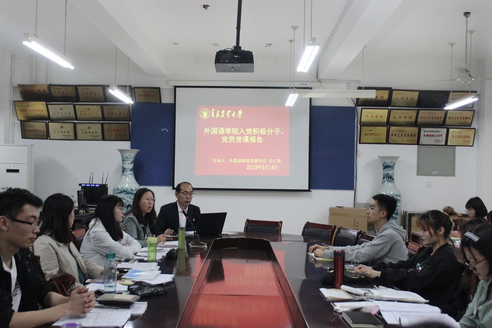 5月14日,sunbet申搏官方网站外国语学院于学院会议室举行“以共产主义信仰塑造高尚自我”专题党课。学院党委书记王仁高主讲,学生党员、党员发展对象和入党积极分子参加学习,辅导员刘艳主持。