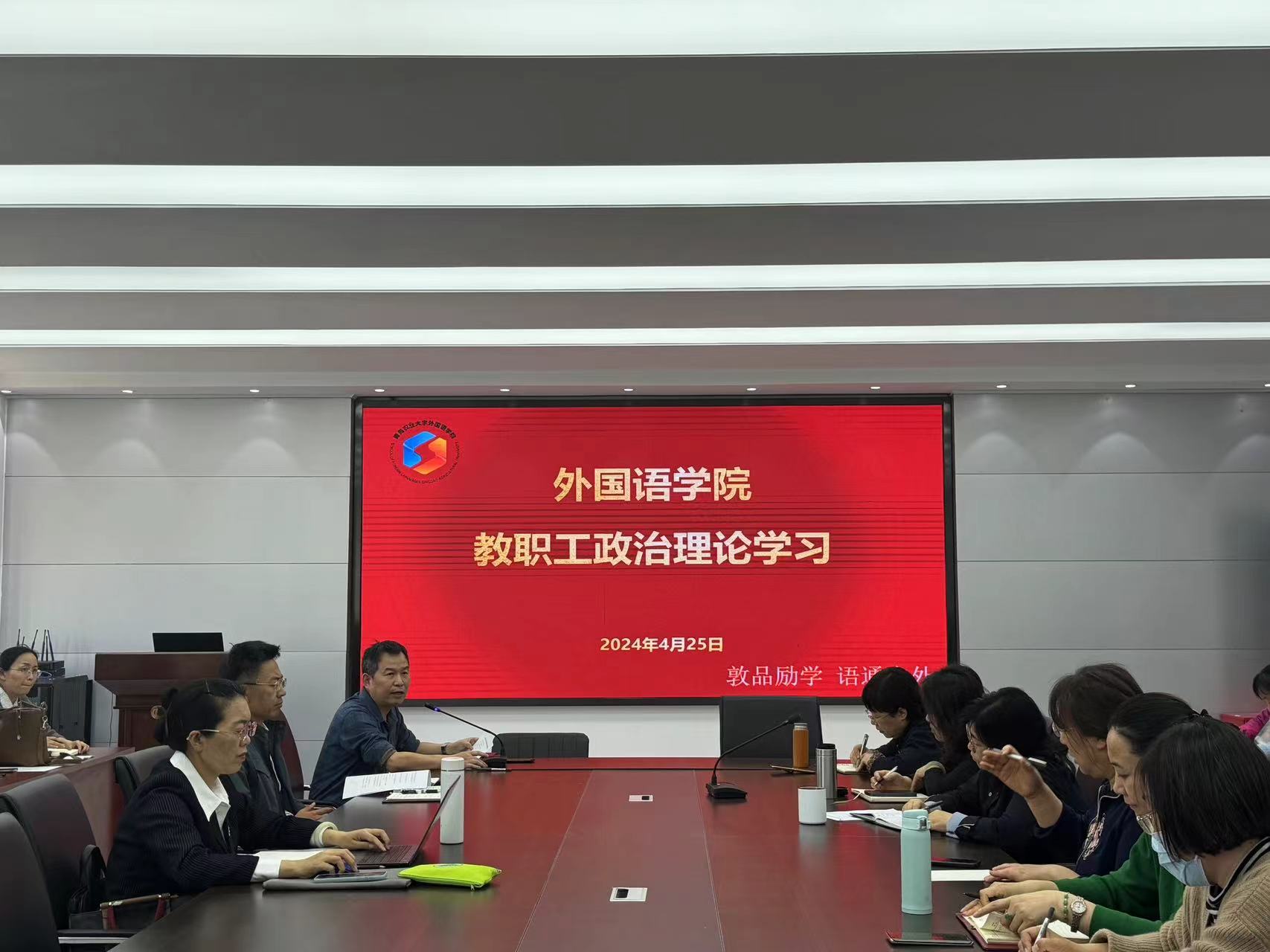 4月25日,外国语学院在文经楼C220会议室举办总体国家安全观专题教职工理论学习会议。会议由外国语学院党委书记王效仿主持,院长纪卫宁、党委副书记副院长盛金玉、副院长高秀雪、李春梅及全体教职工参会。