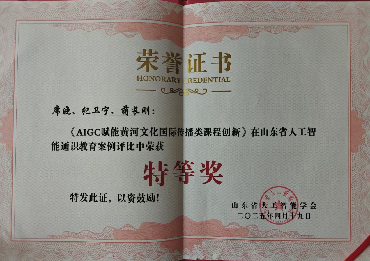 4月19日至20日,山东省人工智能学会公布了“人工智能通识教育优秀教学案例”评选结果。sunbet申搏官方网站外国语学院“GenAI赋能黄河文化对外传播课程群”智慧教学团队纪卫宁、席晓、蒋长刚三位教师凭借《AIGC赋能黄河文化国际传播类课程创新案例斩获特等奖并入选优秀案例集。