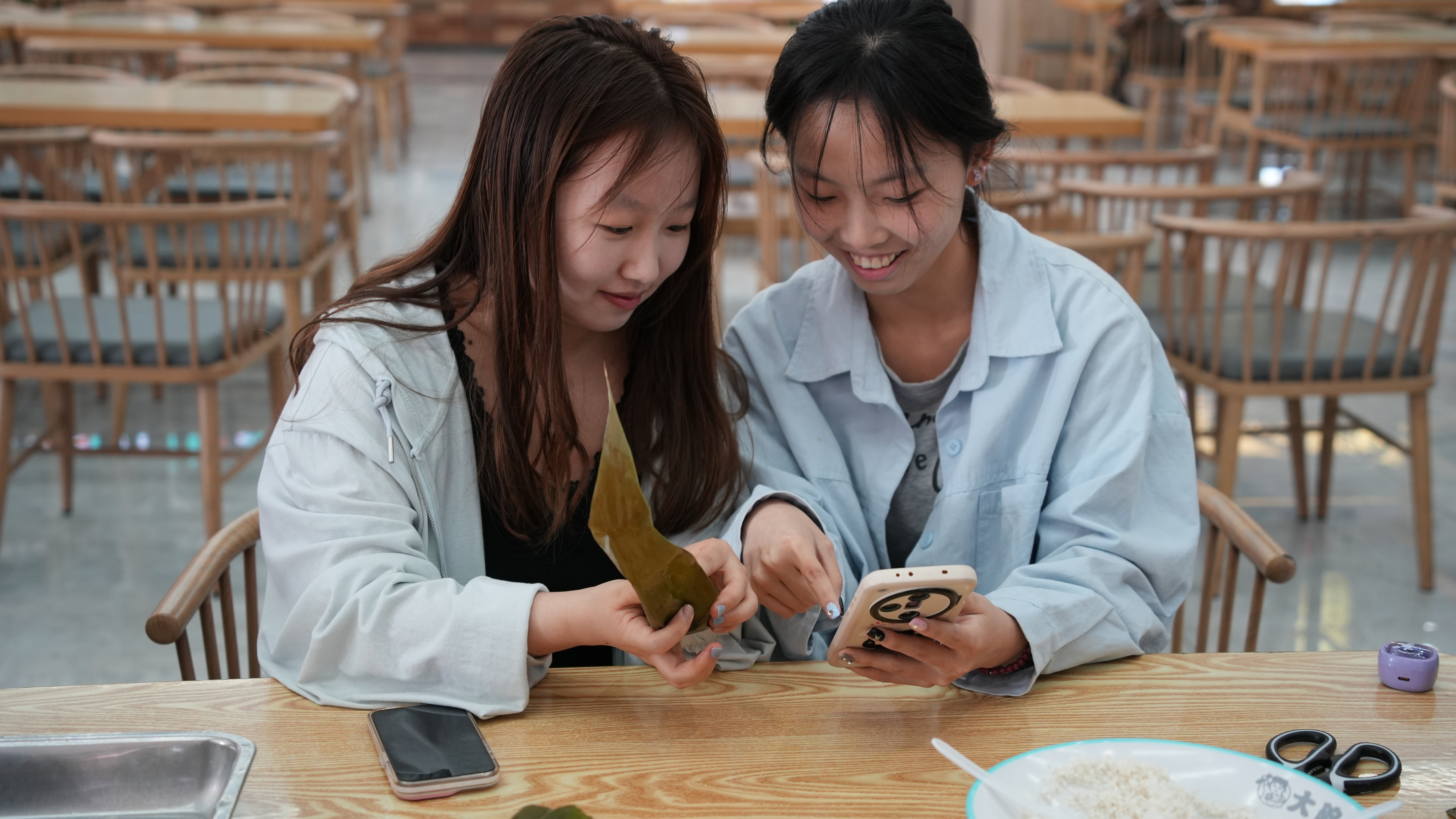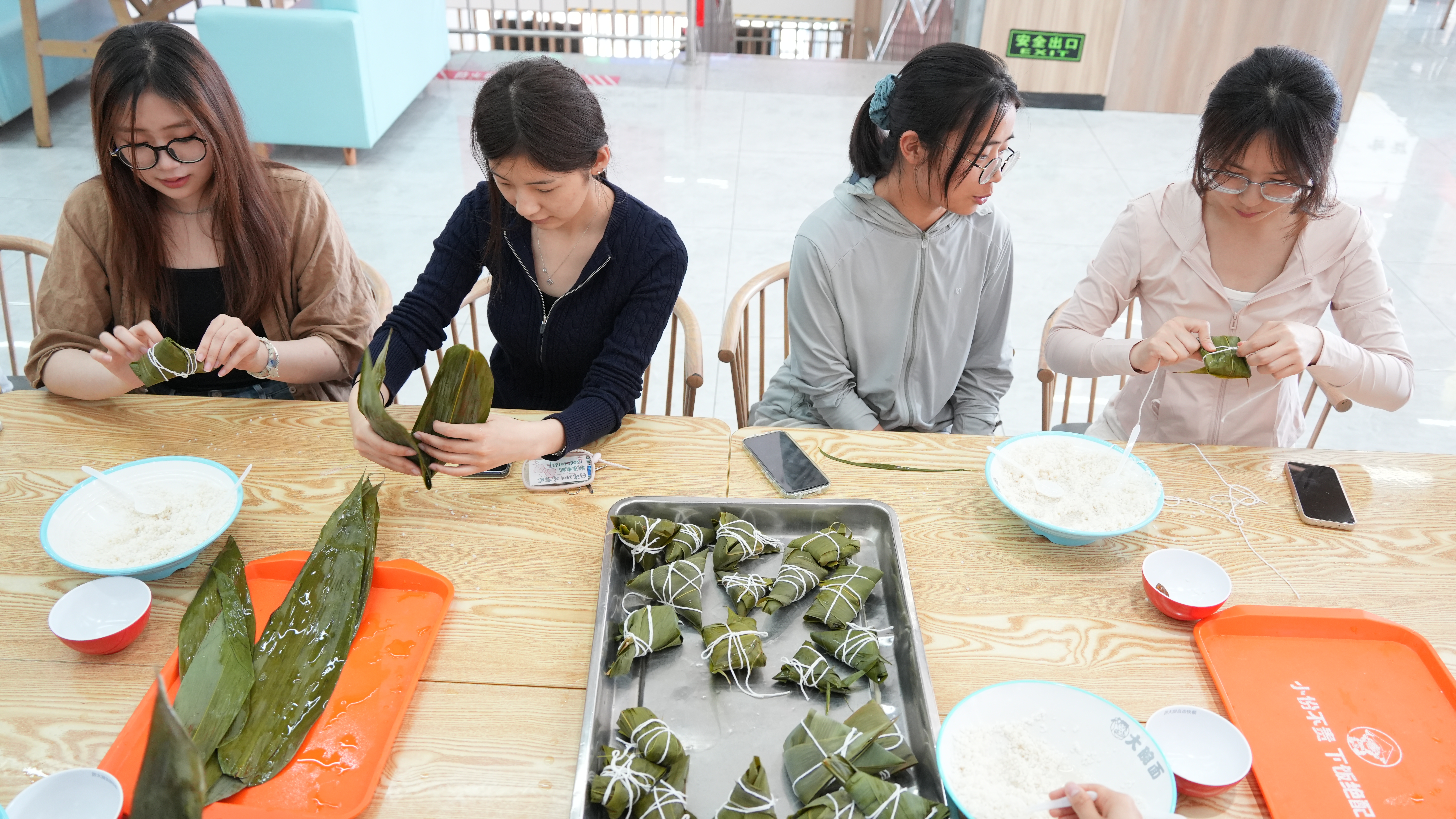 活动现场,专业厨师耐心细致地为学生讲解包粽子的技巧,从食材的精心准备,到粽叶的仔细清洗,再到包制与捆绑,每一个步骤都讲解得详尽入微、一丝不苟。学生们以班级为单位,分成若干小组,协作完成包粽子任务。