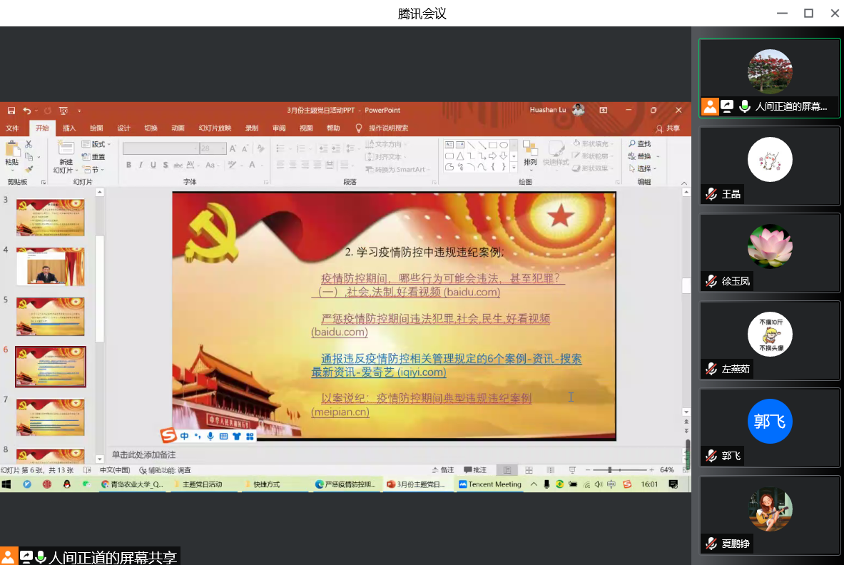 活动前,支部同志们各自在线下提前学习了习近平总书记在中共中央政治局常务委员会会议上关于“始终坚持人民至上、生命至上,尽快遏制疫情扩散蔓延势头”的重要讲话精神。在活动中,通过观看疫情防控中的违纪案例,提高了对疫情防控的思想意识。