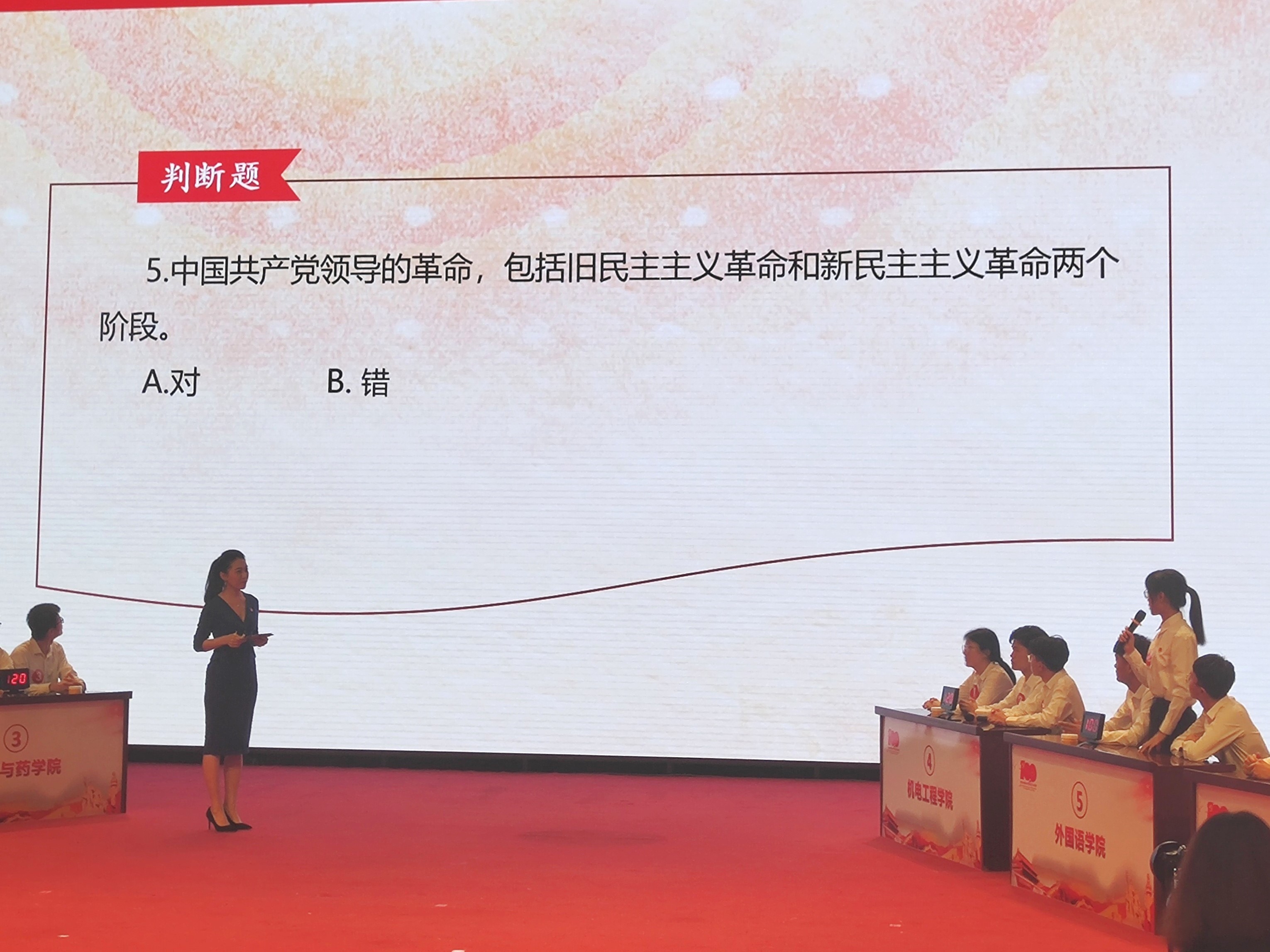 本次比赛共有四个环节,分为“风采展示—必答题”、“时速比拼—抢答题”、“巅峰对决—风险题”、“观众互动答题”。选手们在必答题中沉着应战、稳扎稳打;在抢答题中积极抢答、你追我赶;在风险题中奋力一搏、一决高低。最后,在互动答题环节,观众们积极参与,将现场气氛推向高潮。