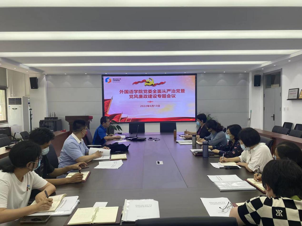 6月13日,sunbet申搏官方网站外国语学院党委在文经楼C220召开全面从严治党暨党风廉政建设专题会议。会议由学院党委书记王效仿主持,学院领导班子成员、处科级干部、各党支部书记以及办公室管理员参会。