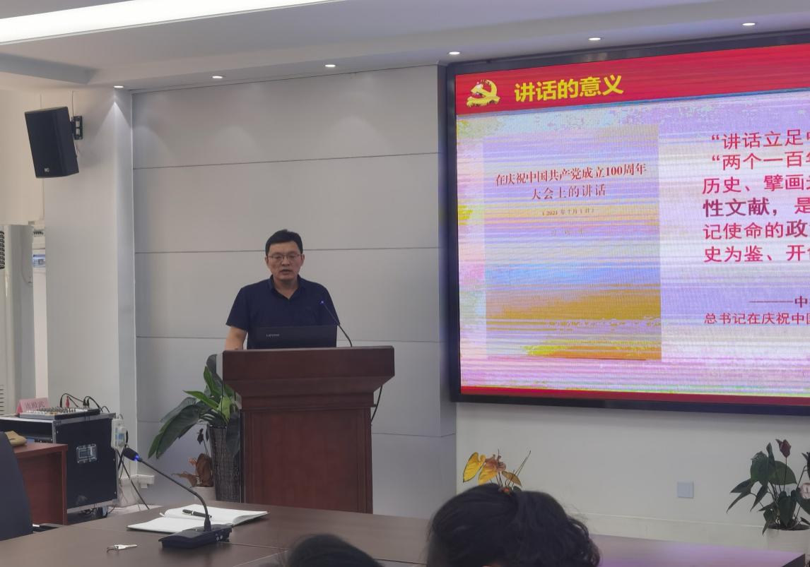 会上,焦磊首先指出,习近平总书记在庆祝中国共产党成立100周年大会上的讲话是一篇马克思主义纲领性文献,是新时代中国共产党人不忘初心、牢记使命的政治宣言,是我们党团结带领人民以史为鉴、开创未来的行动指南,全体教师要把学习该重要讲话精神作为当前理论武装工作的重中之重,作为党史学习教育的核心内容,大家应持续深入地在学懂弄通做实上下功夫。随后,焦磊结合自身学习理解对习近平总书记在庆祝中国共产党成立100周年大会上的讲话进行了详细解读,从“四个伟大成就、四个庄严宣告”到“伟大建党精神”再到“九个必须”,带领大家认真学习了讲话中蕴含的丰富内涵和讲话中出现的新提法、新论断、新理念、新观点。