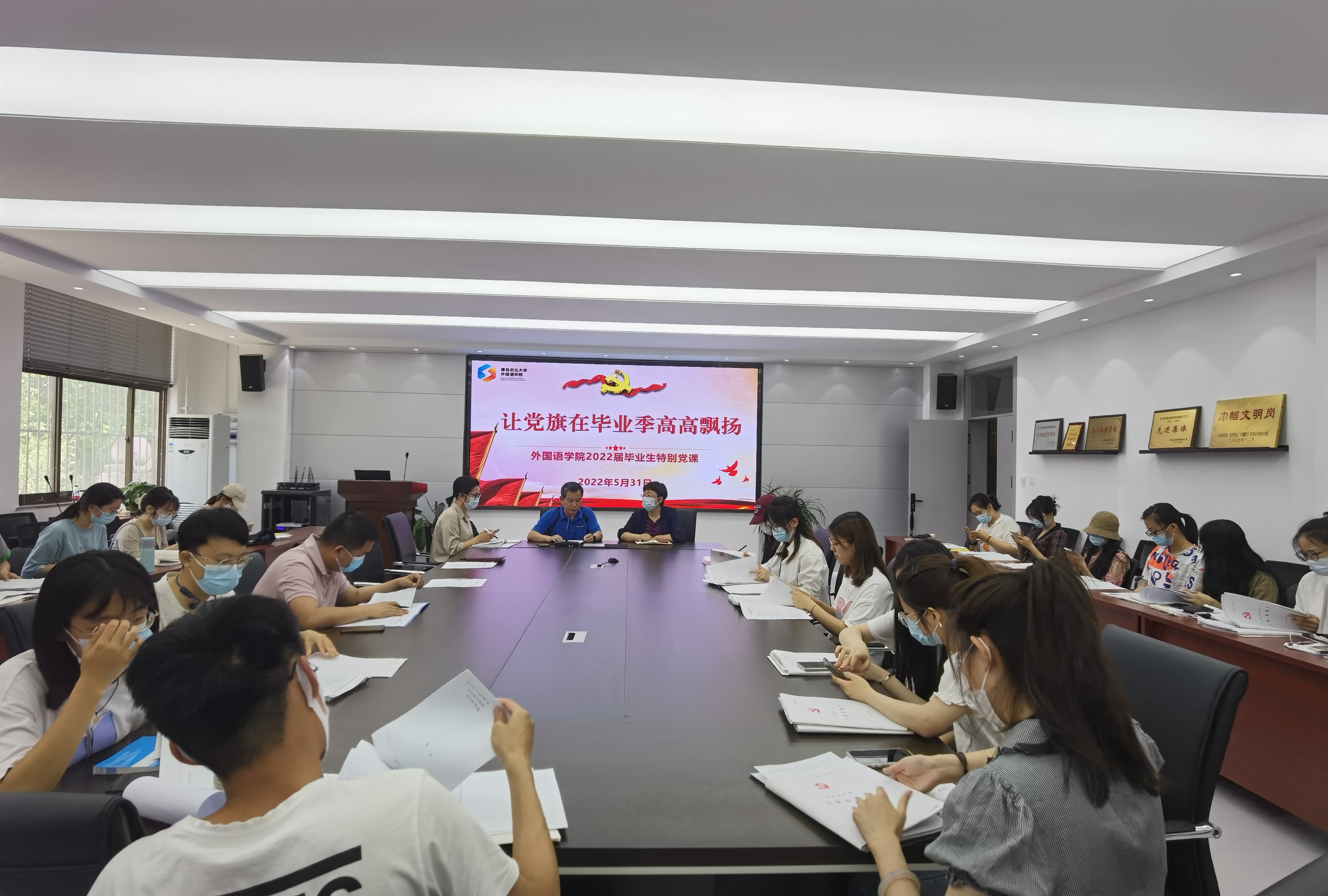 5月31日上午,外国语学院于文经楼C220组织举办毕业生主题党课活动,外国语学院党委书记王效仿为毕业生党员讲授“让党旗在毕业季高高飘扬”主题党课,学院学生工作办公室全体辅导员,毕业班班长、团支部书记参会。