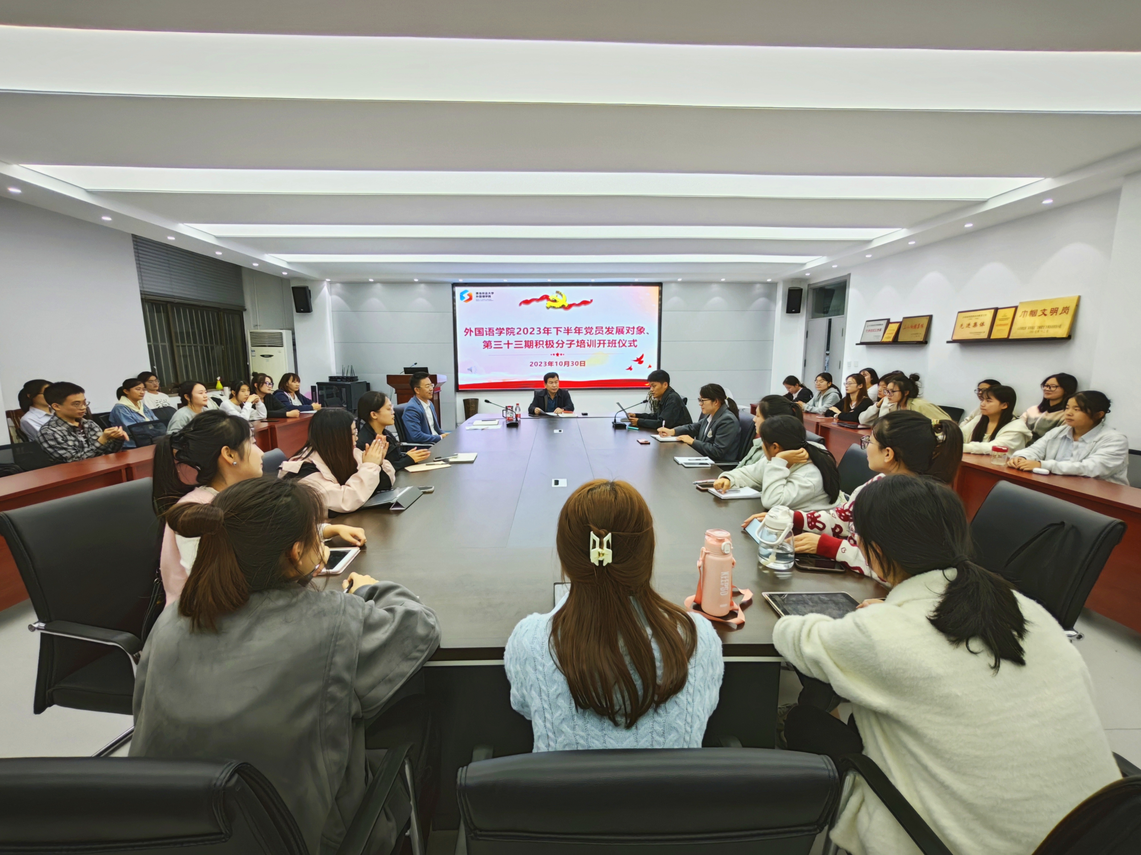sunbet申搏官方网站外国语学院于10月30日在文经楼C220会议室举行2023年下半年党员发展对象和第三十三期入党积极分子培训班开班仪式。外国语学院党委书记王效仿,党委副书记、副院长盛金玉,辅导张玉灵参加,辅导员王洋洋主持开班仪式。