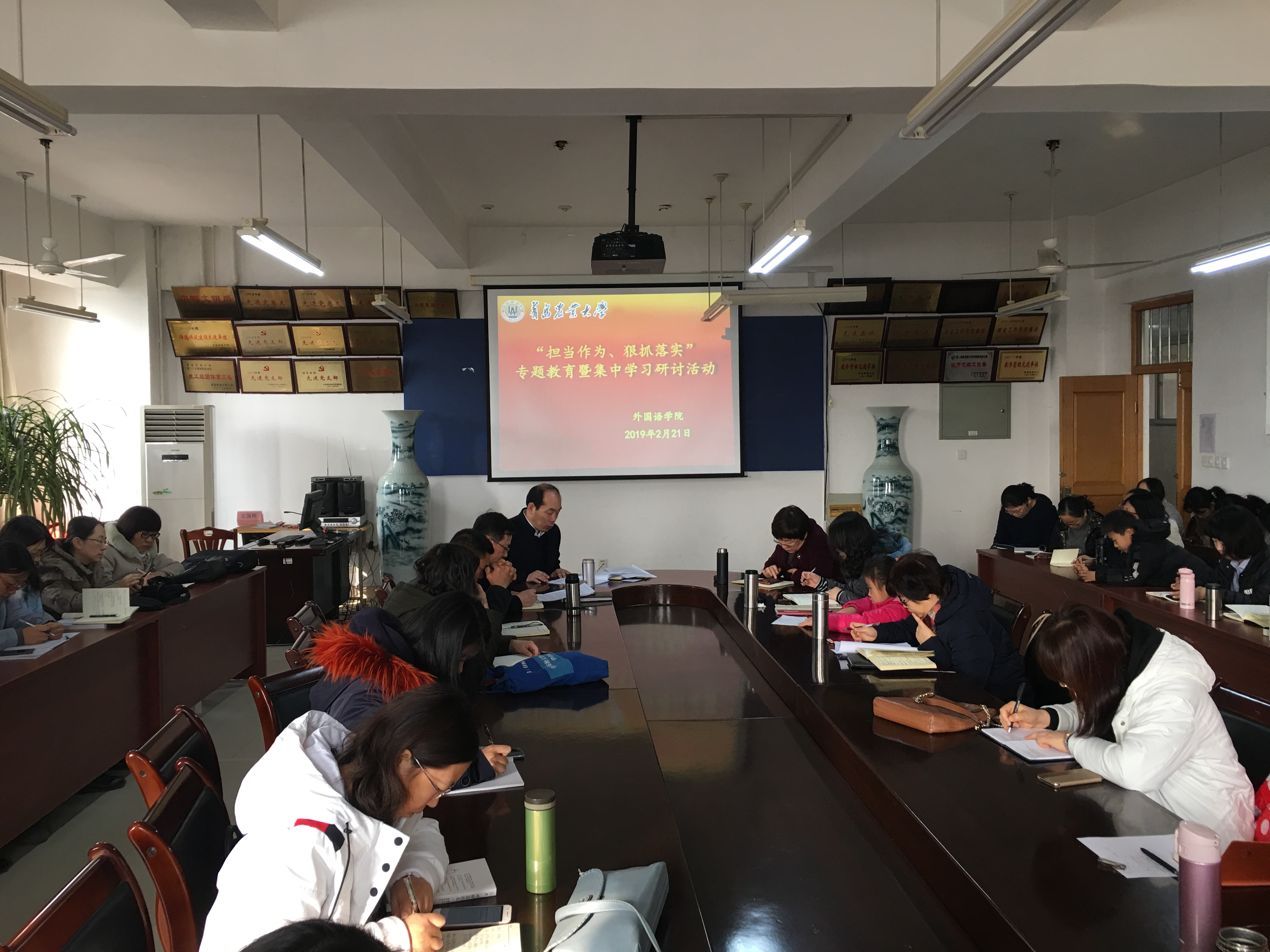 2月21日,外国语学院在文经楼C220开展“担当作为、狠抓落实”专题教育暨集中学习研讨活动。学院党政领导出席会议,全体教职工参加学习交流,会议由党委书记王仁高主持。