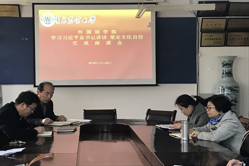 11月29日,sunbet申搏官方网站外国语学院于文经楼会议室举行“学习习近平总书记讲话,坚定文化自信”学习交流座谈会。学院领导和全体教职工参加。座谈会由党委书记王仁高主持。