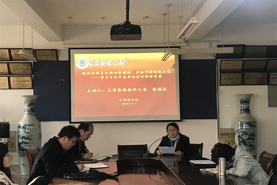 会上,专业英语教研二室韩小敏和大学英语教研二室陈晓庆两位教师分别做了交流发言。韩小敏以“《论语》中孔子的师德修养”为题,阐述了孔子所倡导的师德观,如立志有恒、加强修养,自省自克、改过迁善,以身作则、言传身教,爱护学生、人文关怀等。此外,她还谈到,孔子不仅重视师德修养,同时也重视教学方法上的改进创新,如启发式教学法、因人而异和因材施教的教学理念等。以上这些,可以做到古为今用,把孔子所倡导的传统师德观与当前高校教师师德师风要求相结合,使每一名教师都能明师德、正言行。陈晓庆以“践行社会主义核心价值观,弘扬中国传统文化——学习习近平总书记系列讲话有感”为题,分享了自己学习习近平总书记关于文化建设一系列重要讲话的感想。她认为,高校教师要树立正确的历史观、民族观、文化观,引领学生在学习中感受中华传统文化独特魅力,使文化熏陶进教材、进课堂、进头脑。她特别提到,以往在英语专业教学中存在一定程度的中华传统文化主体性缺失现象,作为英语专业教师,要进一步明确自身的责任担当,正确处理好中国文化与外来文化、传统文化与现实文化的关系,引领学生树立正确的文化观。此外,她还表示,将开设《中国文化概论》课程,使英语专业教学与中华优秀文化教育相融合。