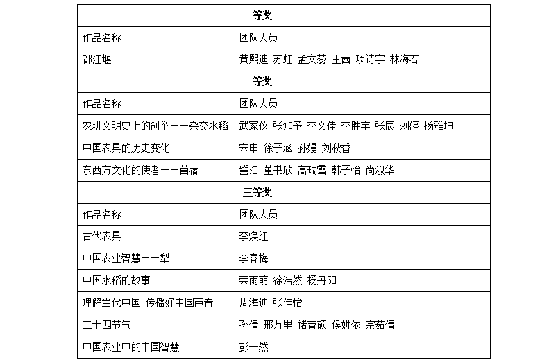 近日,sunbet申搏官方网站2023年大学生英语创新大赛“理解当代中国,传播好中国声音”微视频校赛圆满结束,本次校赛主题是“感悟农耕智慧 传承农业文明”,大赛共收到来自全校29个专业65名学生的34项作品。经过专家对作品主题、作品思想、英语表达、视频制作等方面的客观公正评审,共评选出10项获奖作品,一等奖1项,二等奖3项,三等奖6项。现将获奖作品公布如下: