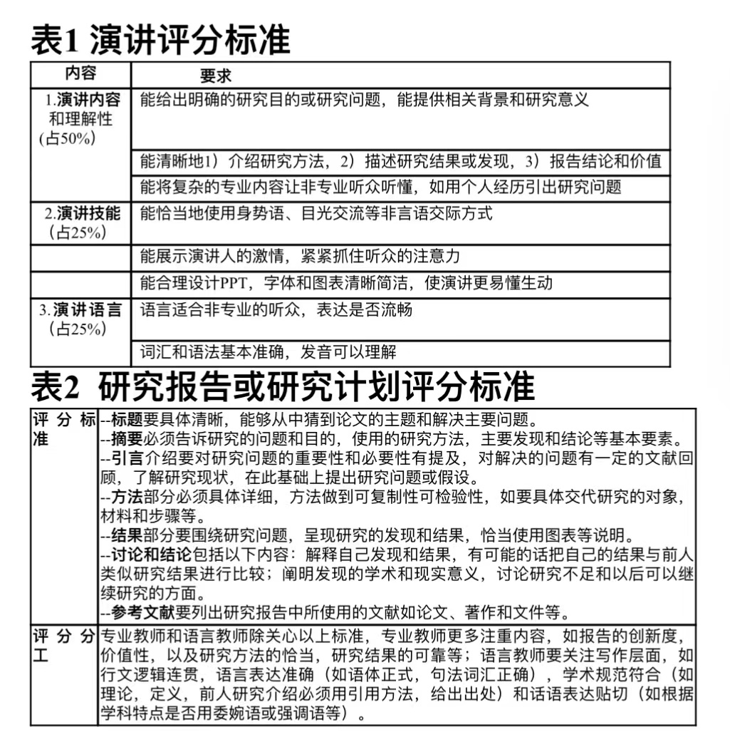 1.研究报告或研究计划(附件1)。演讲作品是基于一篇用英语撰写的研究报告或研究计划。研究报告包括标题、摘要、引言、方法、结果、讨论和结论、致谢和参考文献等基本部分。长度不少于 2000 英语单词。研究计划包括标题、摘要、研究目的、研究意义、文献回顾、研究问题、拟采用方法、预期结果和参考文献。长度在 1500 词左右。评分标准见表2.