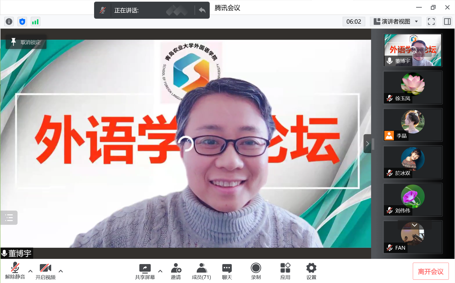 3月31日,sunbet申搏官方网站外国语学院通过腾讯会议召开线上外语学术论坛第十七讲。此次学术论坛由英语专业二室董博宇博士主讲,题目为《谴责合理化依据的会话分析研究》,学院全体领导、教职工与会,副院长高秀雪教授主持论坛。