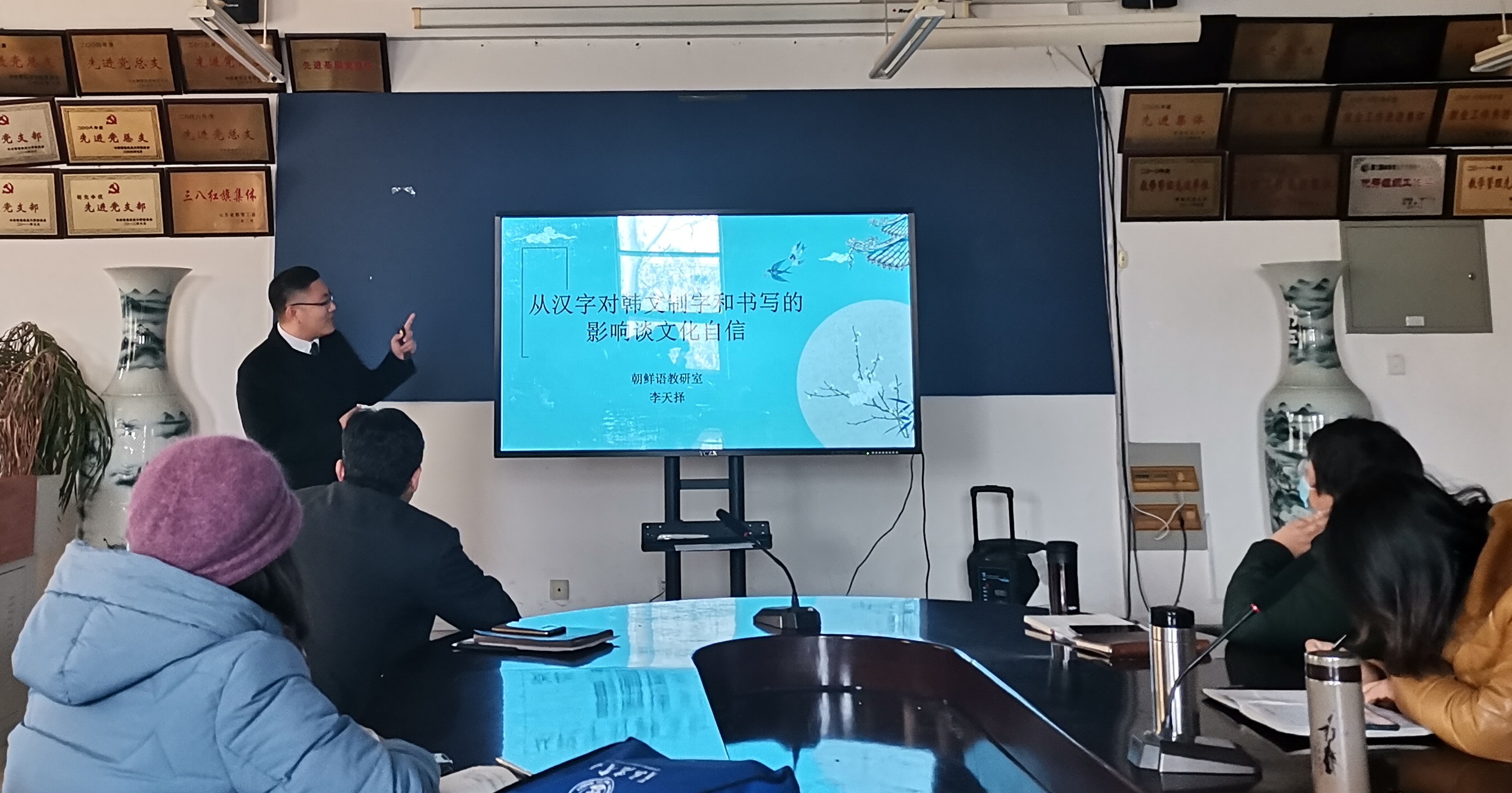 12月17日,sunbet申搏官方网站外国语学院于文经楼会议室开展外语学术论坛第十六讲。此次学术论坛由毕业于韩国高丽大学的李天择博士主讲,主讲题目为《从汉字对韩文制字和书写的影响谈文化自信》,学院全体领导、教职工与会,副院长高秀雪教授主持论坛。