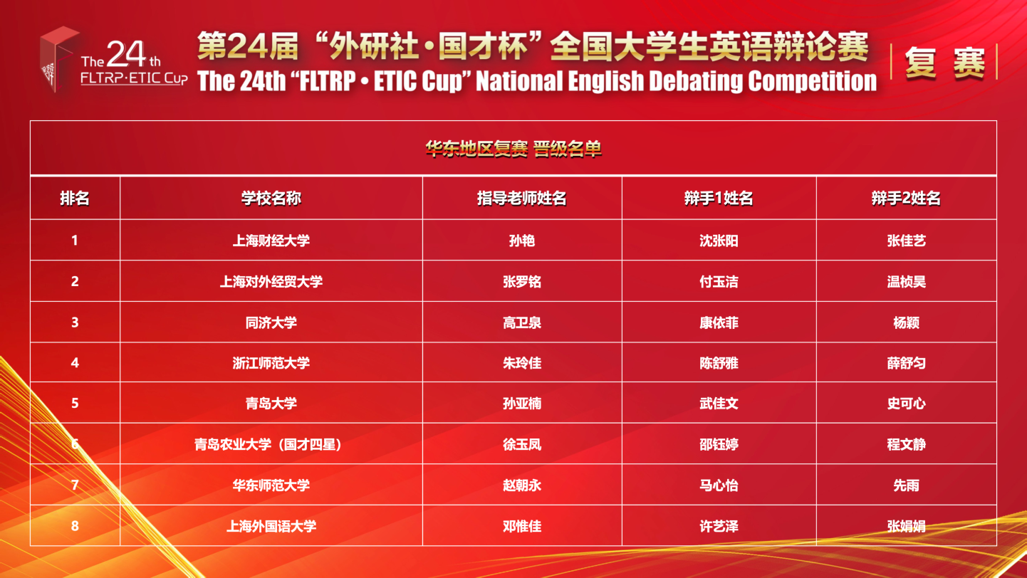4月9日至10日,2022“外研社•国才杯”全国大学生英语辩论赛华东赛区复赛如期举办。参加本次复赛的有来自山东省、安徽省、江苏省、上海市和浙江省的121支队伍。sunbet申搏官方网站外国语学院徐玉凤老师指导的邵钰婷、程文静同学获得本次复赛的一等奖,以第六名的好成绩顺利晋级全国大学生英语辩论赛国赛。这是sunbet申搏官网在参加全国大学生英语辩论赛以来取得的最好成绩,首次晋级全国决赛。外国语学院的刘宇、王岩同学获得本次地区赛的三等奖。