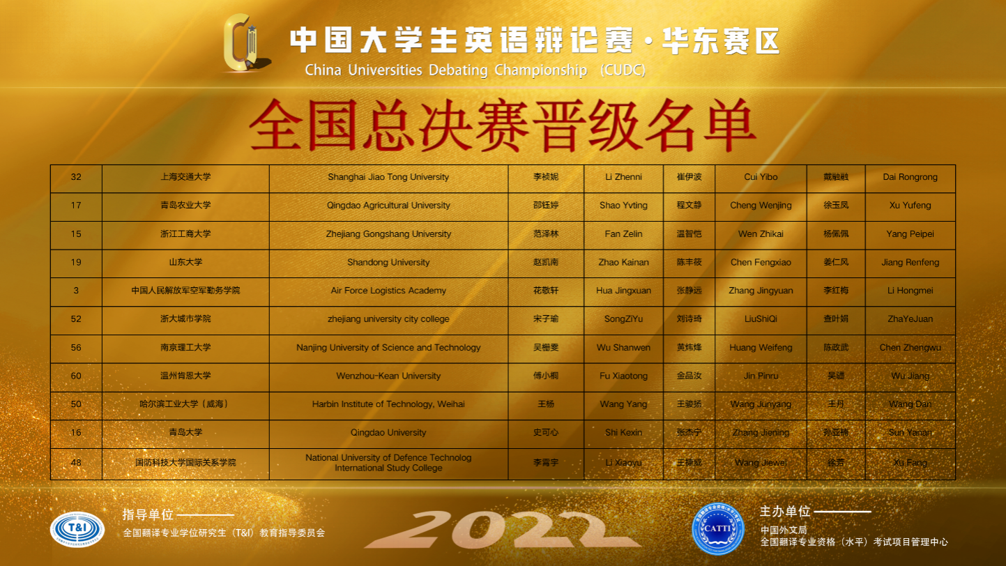 CUDC中国大学生英语辩论赛由中国外文局全国翻译专业资格(水平)考试项目管理中心主办。今年的华东赛区比赛覆盖了上海市、浙江省、江苏省、安徽省和山东省。华东区比赛共有60支队伍参加,包括复旦大学、上海外国语大学、上海交通大学、浙江大学、山东大学、华东师范大学、同济大学、华东理工大学、上海财经大学、青岛大学等高校。