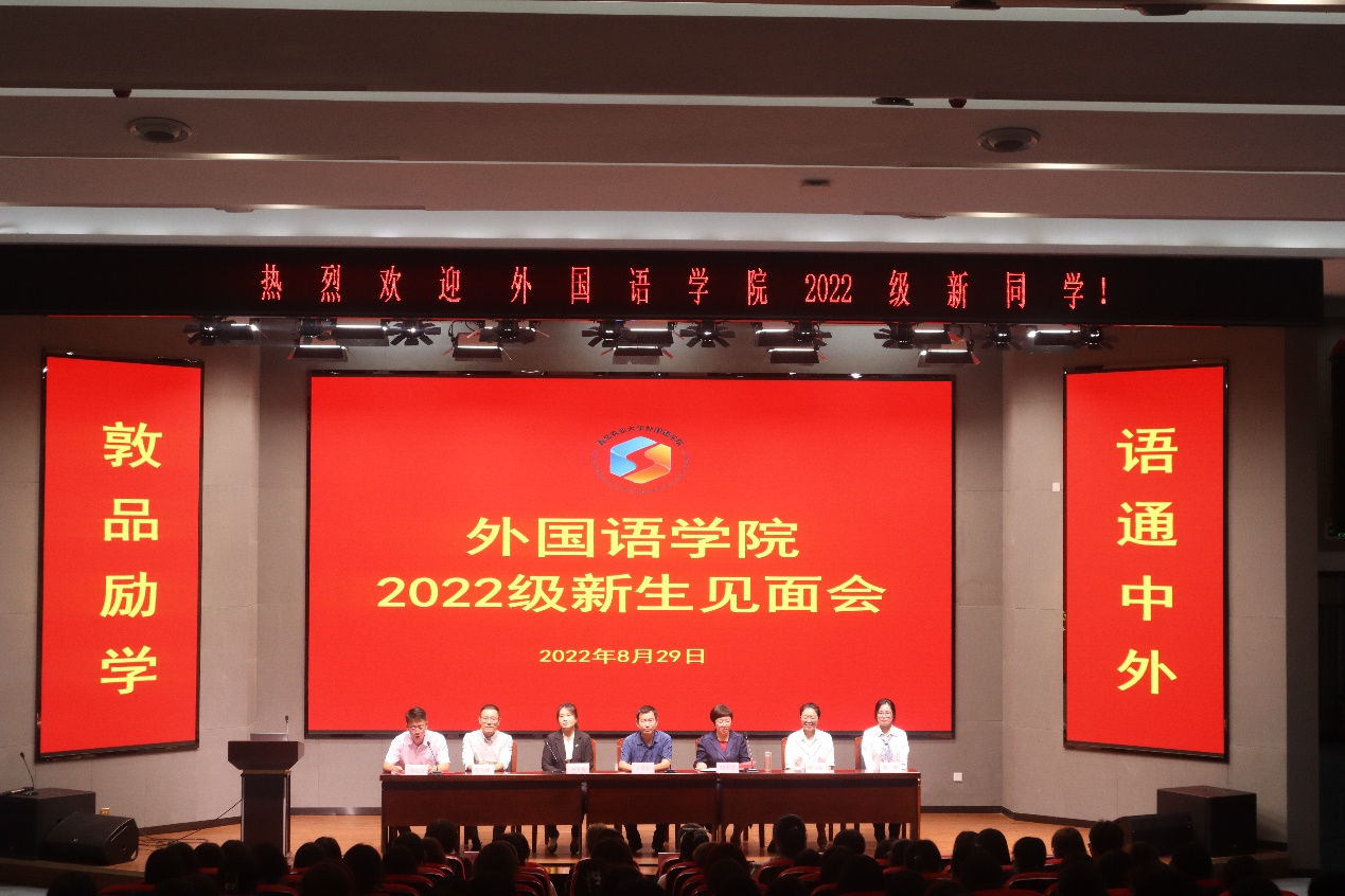 2022年8月29日,sunbet申搏官方网站外国语学院在平度校区博学楼多功能厅召开2022级新生见面会,外国语学院党委书记王效仿、院长纪卫宁、副院长李春梅、系主任和副主任代表,学院办公室和学生工作办公室成员以及学院2022级来自不同省市的303名新生参加会议。本次会议由学院党委副书记、副院长盛金玉主持。