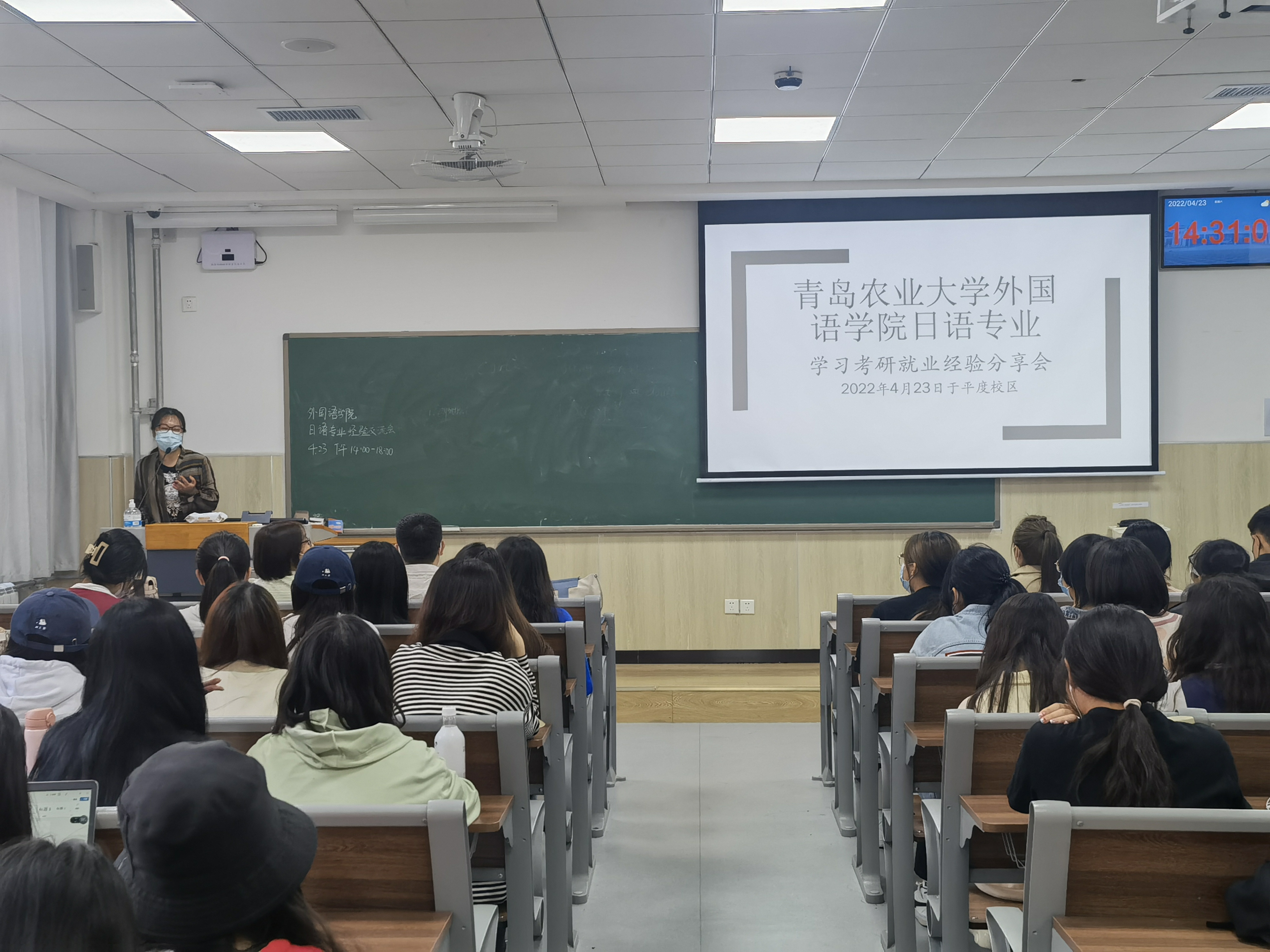 随后,来自18级的日语专业考研代表张恒、张玉华进行考研经验讲座。她们各自分享了自己择校、备考历程等细节,并强调考研要早做打算,且最好提前一年至两年关注目标院校、收集相关信息;20级的孙善卓则分享了关于兼职经历、就业规划与个人兴趣跟专业的相关性等内容,以自身宝贵经验引导学生对今后的学习、生涯规划进行更深入的思考,激起了同学们学习日语的热情。