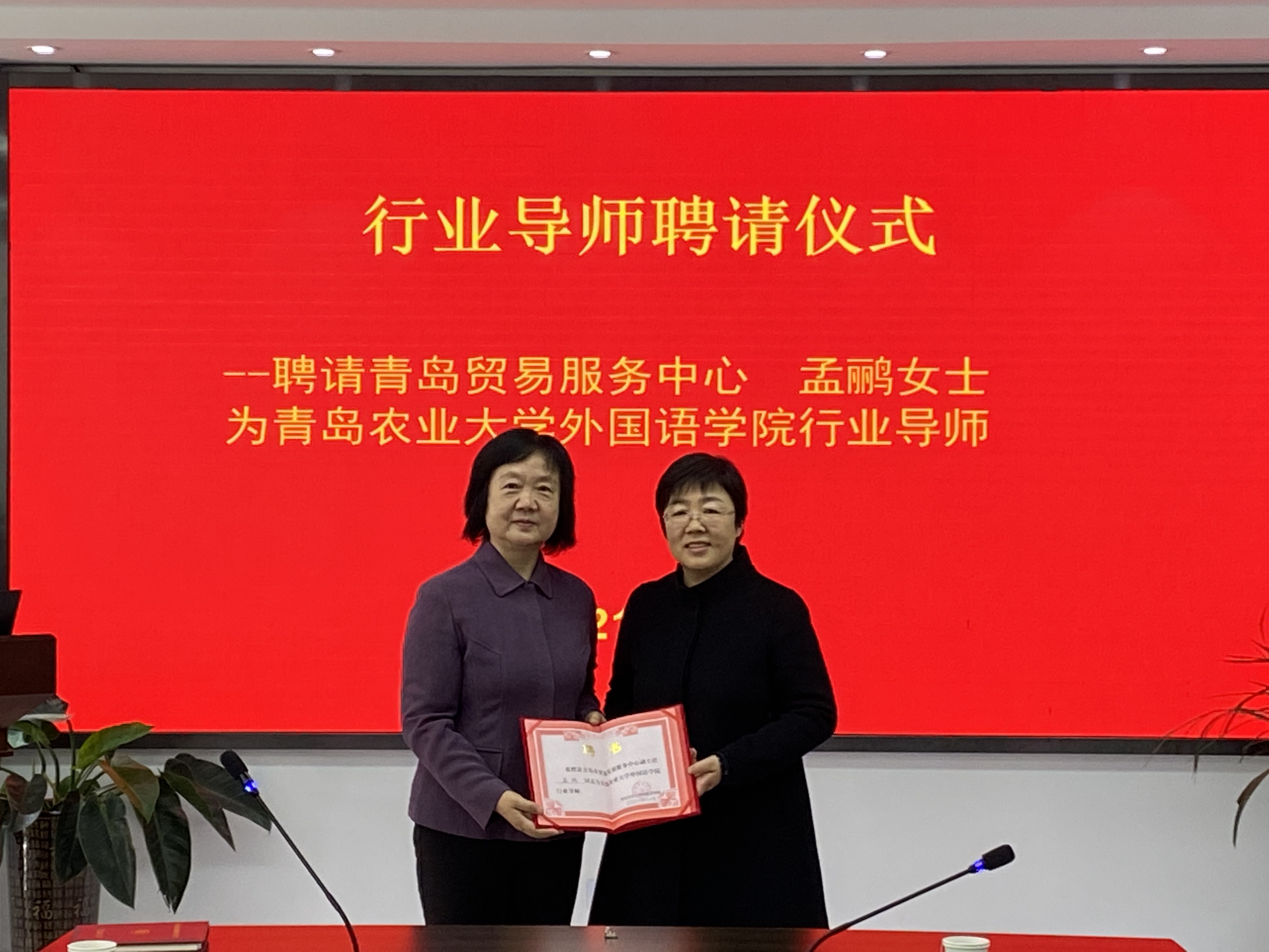 首先,在聘任仪式中,万礼介绍了孟鹂女士多年来为日语专业实践教学给与的指导,并宣布外国语学院正式聘任孟鹂为学院行业导师。随后,纪卫宁院长为孟鹂女士颁发聘书,在场师生以阵阵热烈掌声表示祝贺。