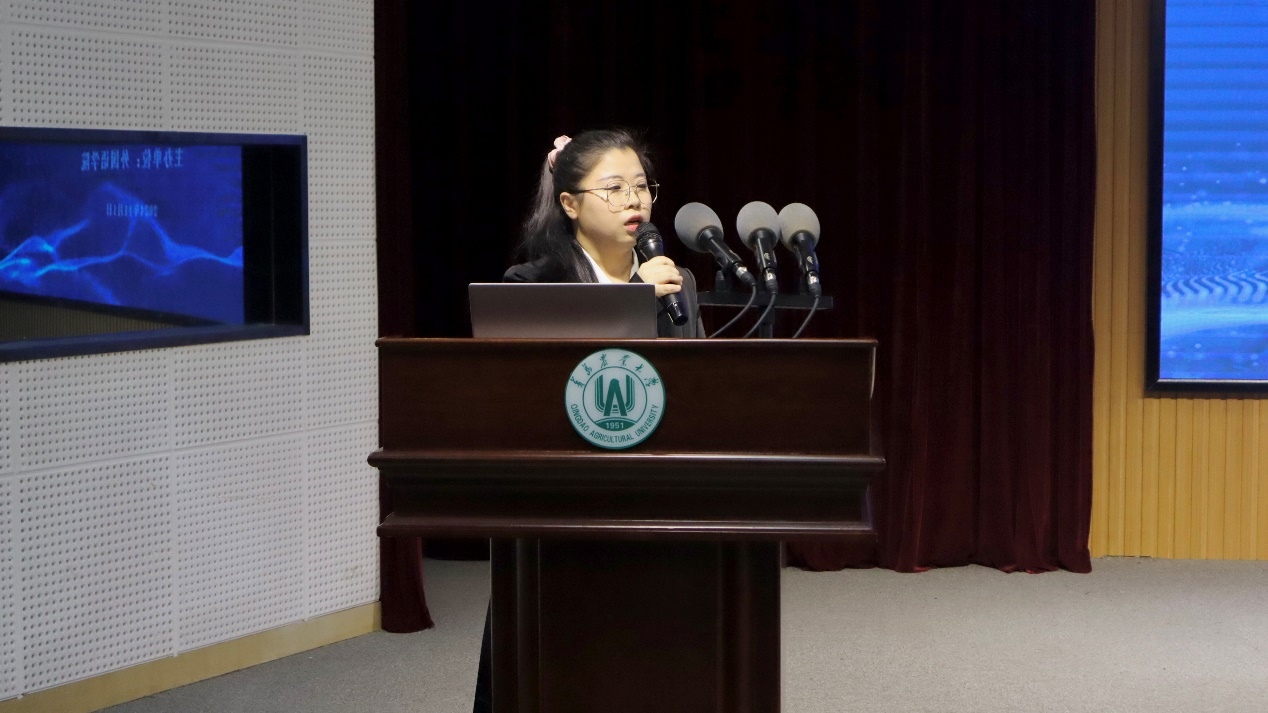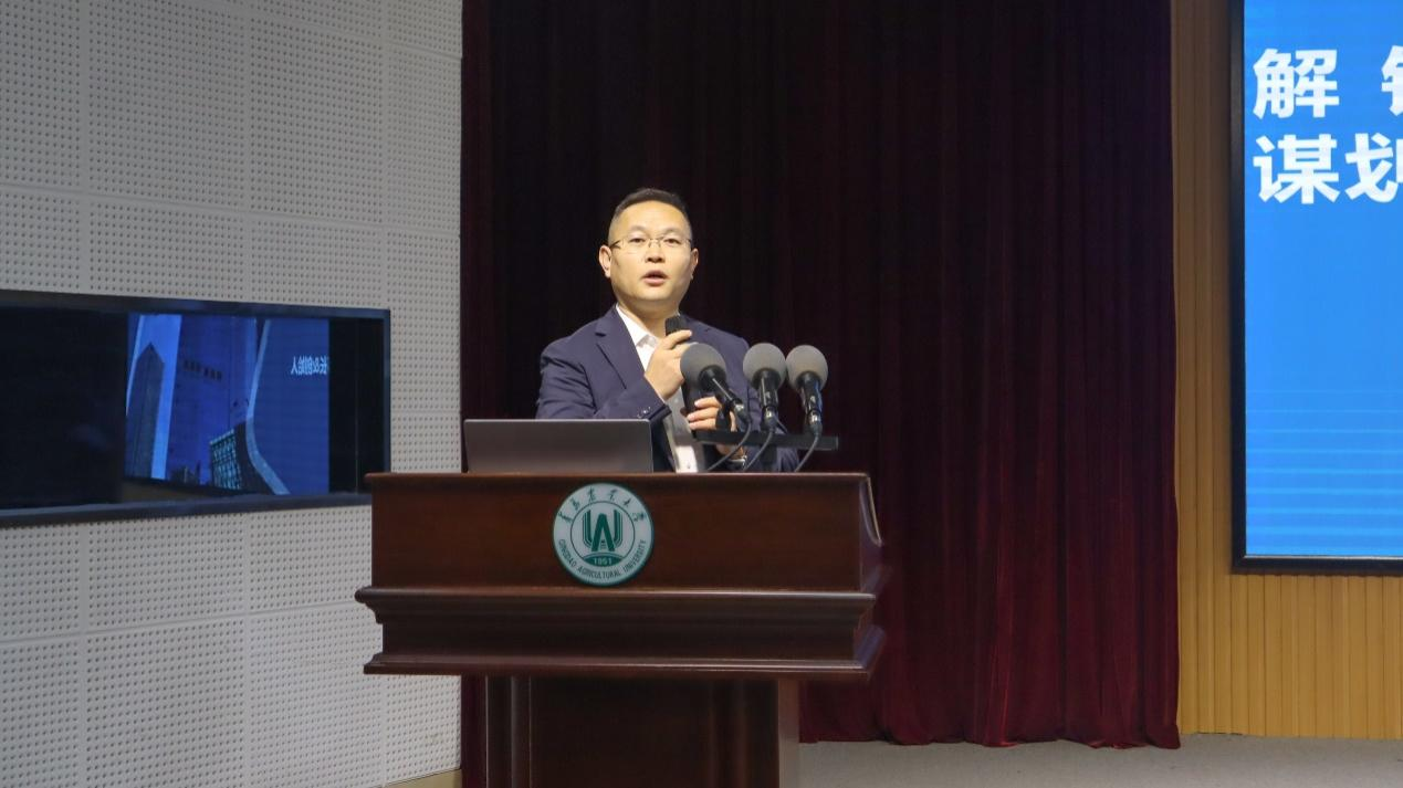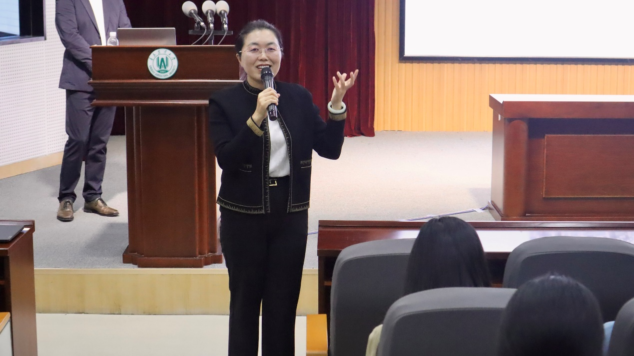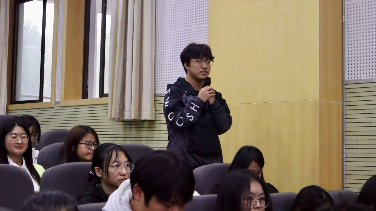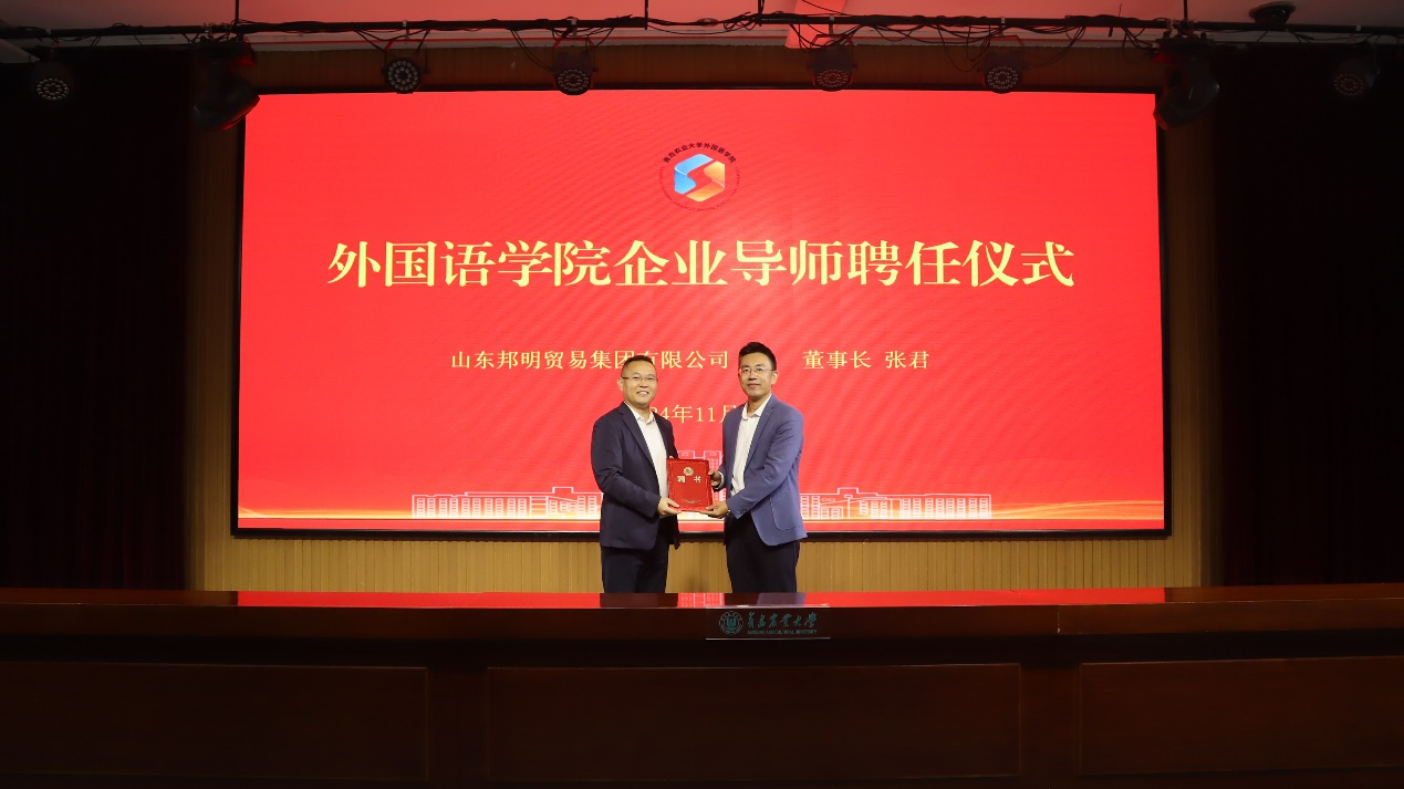 活动伊始,盛金玉为山东邦明集团董事长张君颁发聘书,聘任其为外国语学院企业导师,盛金玉对张君表示感谢,希望进一步加强沟通交流,助力外国语学院的高质量发展。张君以《解锁国际贸易,谋划职业精彩未来》为题进行分享,围绕外贸背景,邦明与农大,从事外贸必备素质,外贸公司类别,外贸人才标准,实习与就业准备六个方面具体讲述,强调了学院学生从事外贸工作的优势以及外贸行业的基本要求。随后,张君还就外贸事业与就业问题与同学深入交流,答疑解惑。郭畅为同学们讲解了秋招的重要信息,助力学院学生职业发展。