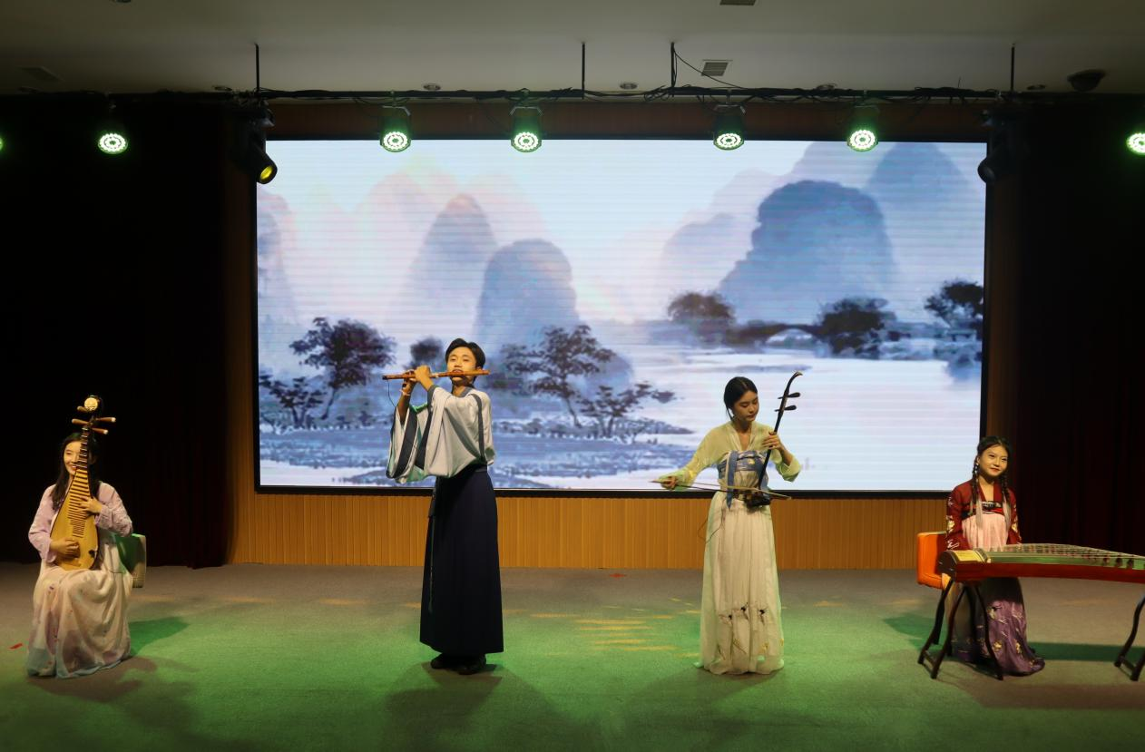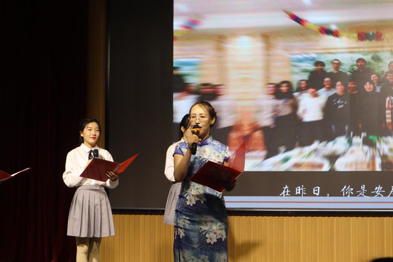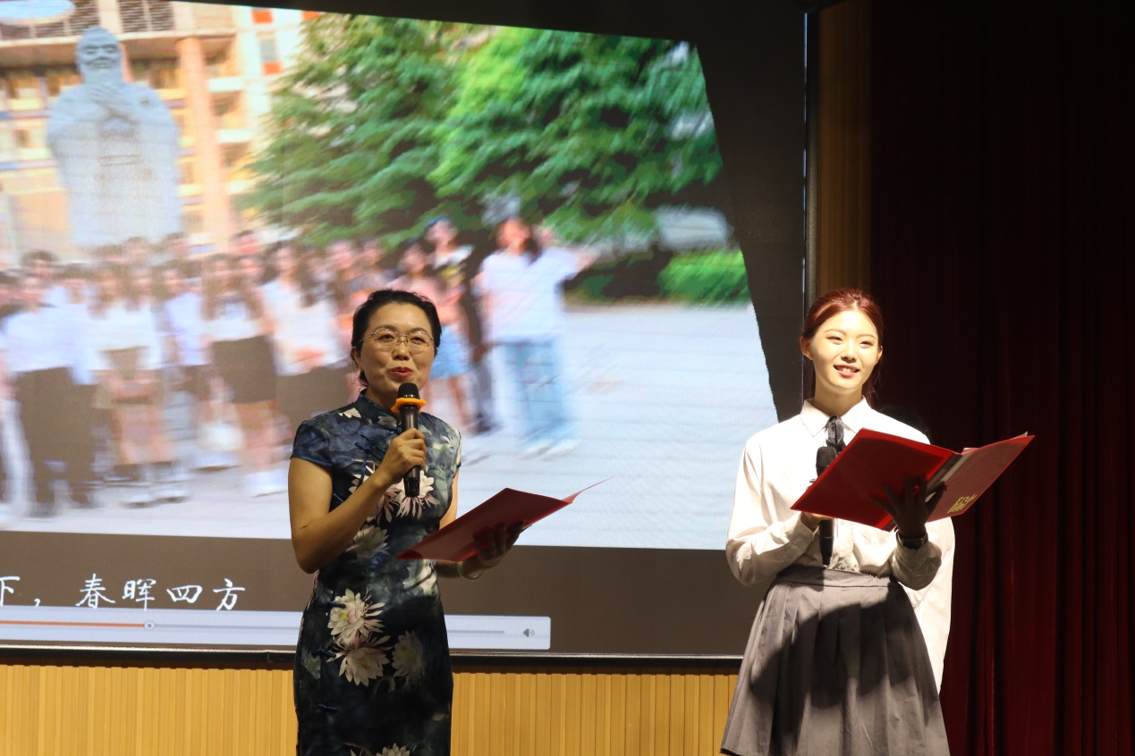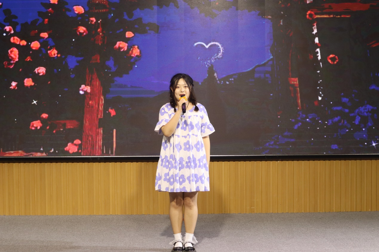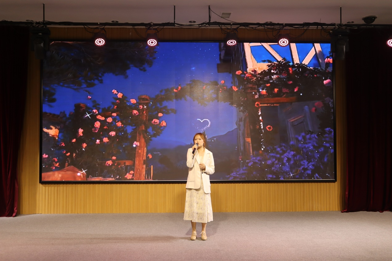 民乐表演《兰亭序》,琵琶、二胡、长笛、古筝合奏,典雅不失深情,营造了韵味悠长的古典氛围。朗诵《大学恋歌》,由中、英、日、韩四国语言吟诵出的诗篇令在场观众耳目一新。英语专业教研室主任徐玉凤老师和2022届毕业班班主任代表范杰老师与学生的互动式朗诵生动展现了师生之间的深情厚谊。