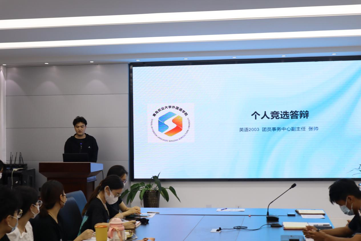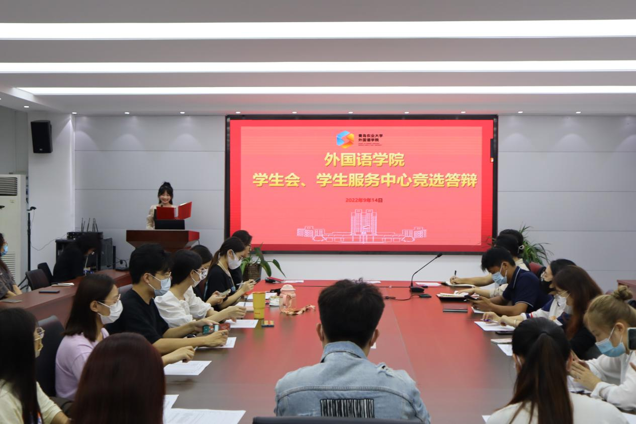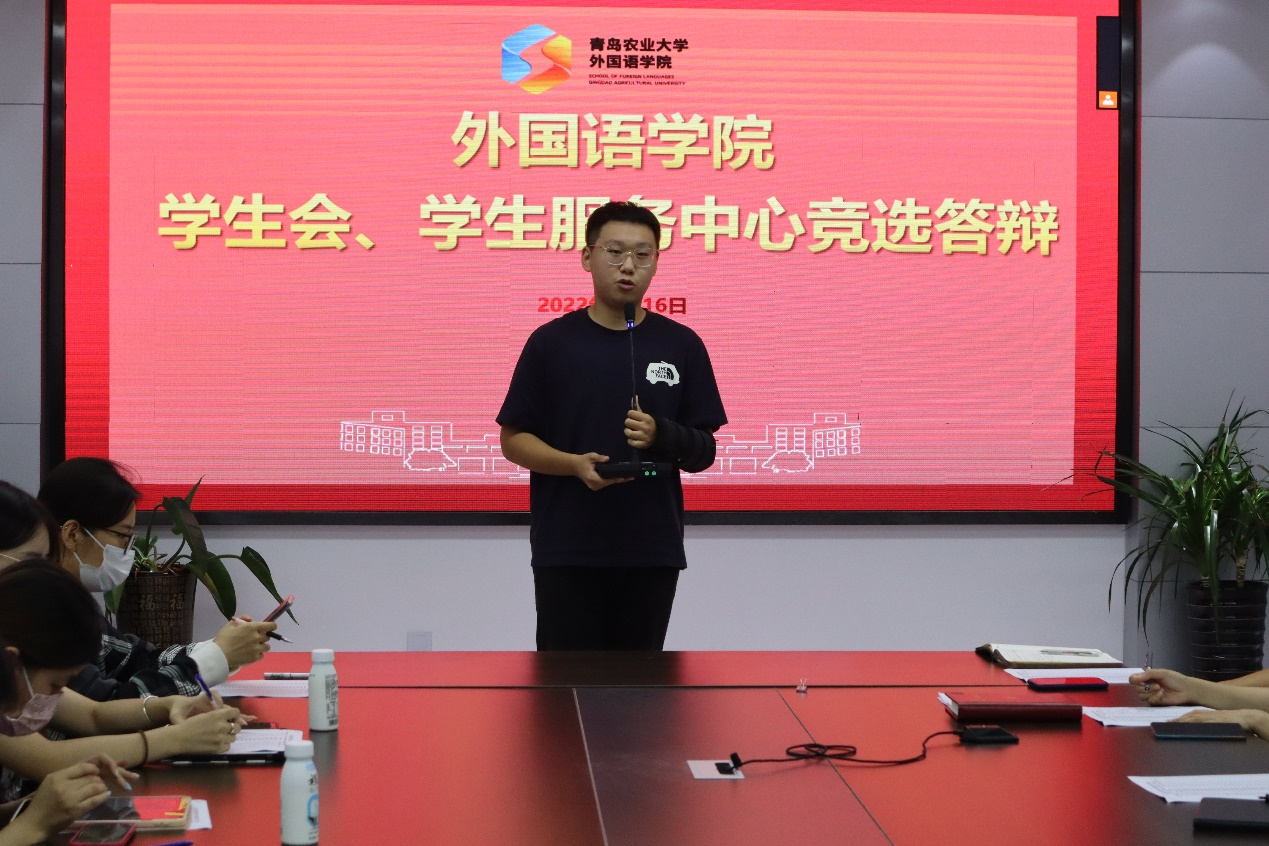 9月16日下午,sunbet申搏官方网站外国语学院召开学生会、学生服务中心换届竞职答辩大会。外国语学院党委副书记、副院长盛金玉以及团委书记线郁、辅导员王洋洋、仇文峰出席并担任评委,全体参加竞选的学生干部参会。大会由大学生艺术团组长吕舒心主持。