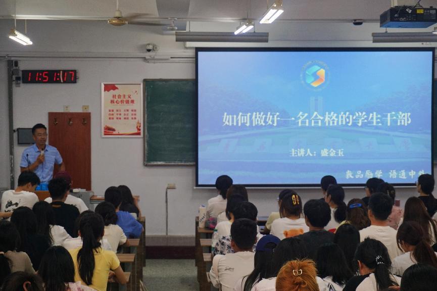 盛金玉以“开学第一课”的形式,从学风建设、竞赛比赛、社会实践、校园活动、志愿服务等五个方面,对上半年学团工作进行总结,肯定了学团工作成绩,指出了工作中的不足和改进措施。随后,盛金玉就如何做一名合格的学生干部进行深入交流。他强调,学生干部是组织学生自我教育、自我管理和自我服务的中坚力量,学生干部要树立正确的价值观和服务意识,以身作则,严格要求自己。盛金玉指出学生干部应具备四种基本能力:一是以“学”字为基,提高乐学能力,学习专业知识、政治理论、他人长处;二是以“生”字为标,提高成长能力,展现生命力量、青春活力、胸怀品格;三是以“干”字为要,提高执行能力,树牢服务同学的意识,养成挺庸担当的精神,练就踏实肯干的作风;四是以“部”字为首,提高谋划能力,培养家国情怀,开拓国际视野,坚持系统观念。