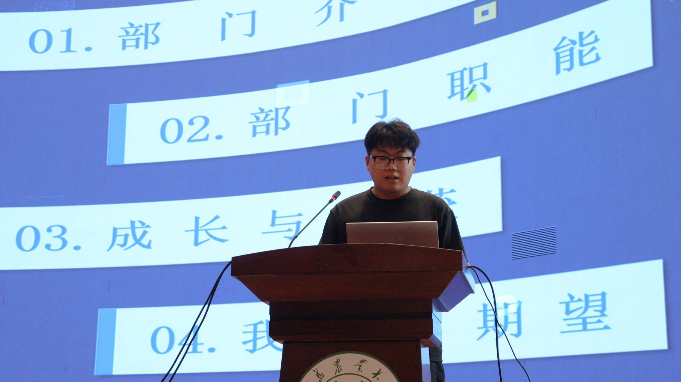 外国语学院学生会及学生服务中心各部门负责人依次上台宣讲。他们通过PPT、视频、图片等多种形式,生动展示了各自部门的组织架构、工作职责、特色活动以及历年来的工作成果。宣讲过程中,现场气氛热烈,新生们聚精会神地倾听。