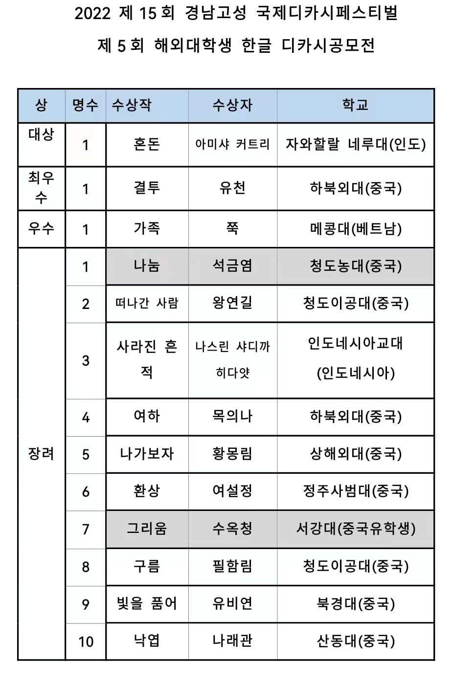2022年第五届《海外大学生韩国语诗创作》大赛是由韩国digital camera研究所主办,中国、日本、印度、印度尼西亚、越南等国在读大学生或者韩国留学学生参与的大规模赛事。大赛从今年4月11日启动,历时19天共有来自海内外13所大学的304部作品参赛。比赛由知名度高的韩国专家团队进行严格评审。