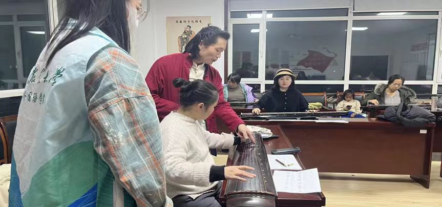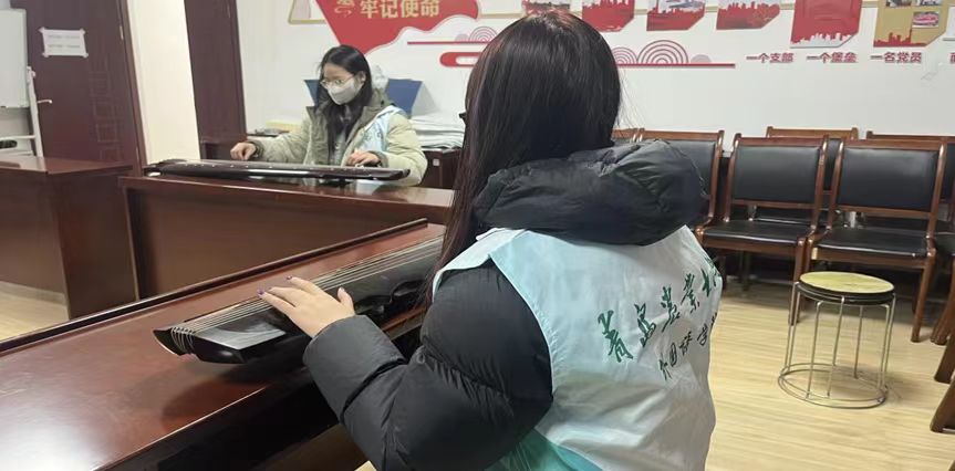 12月6日,外国语学院志愿者应社区邀请来到春阳路社区,与社区居民一同开启了一堂古琴学习课,沉浸式体验了古琴文化的魅力。