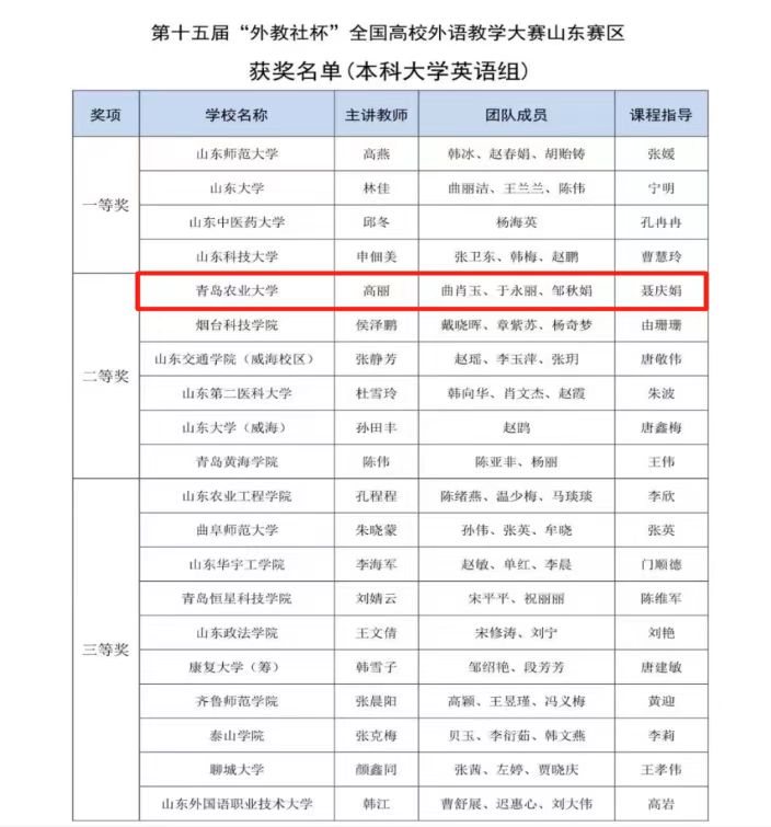 5月10日至12日,第十五届“外教社杯”全国高校外语教学大赛山东赛区复赛和决赛在山东师范大学(长清湖校区)举行,外国语学院英语系董博宇教师团队获本科英语专业组一等奖、大学英语第二教学部高丽教师团队获本科大学英语组二等奖。