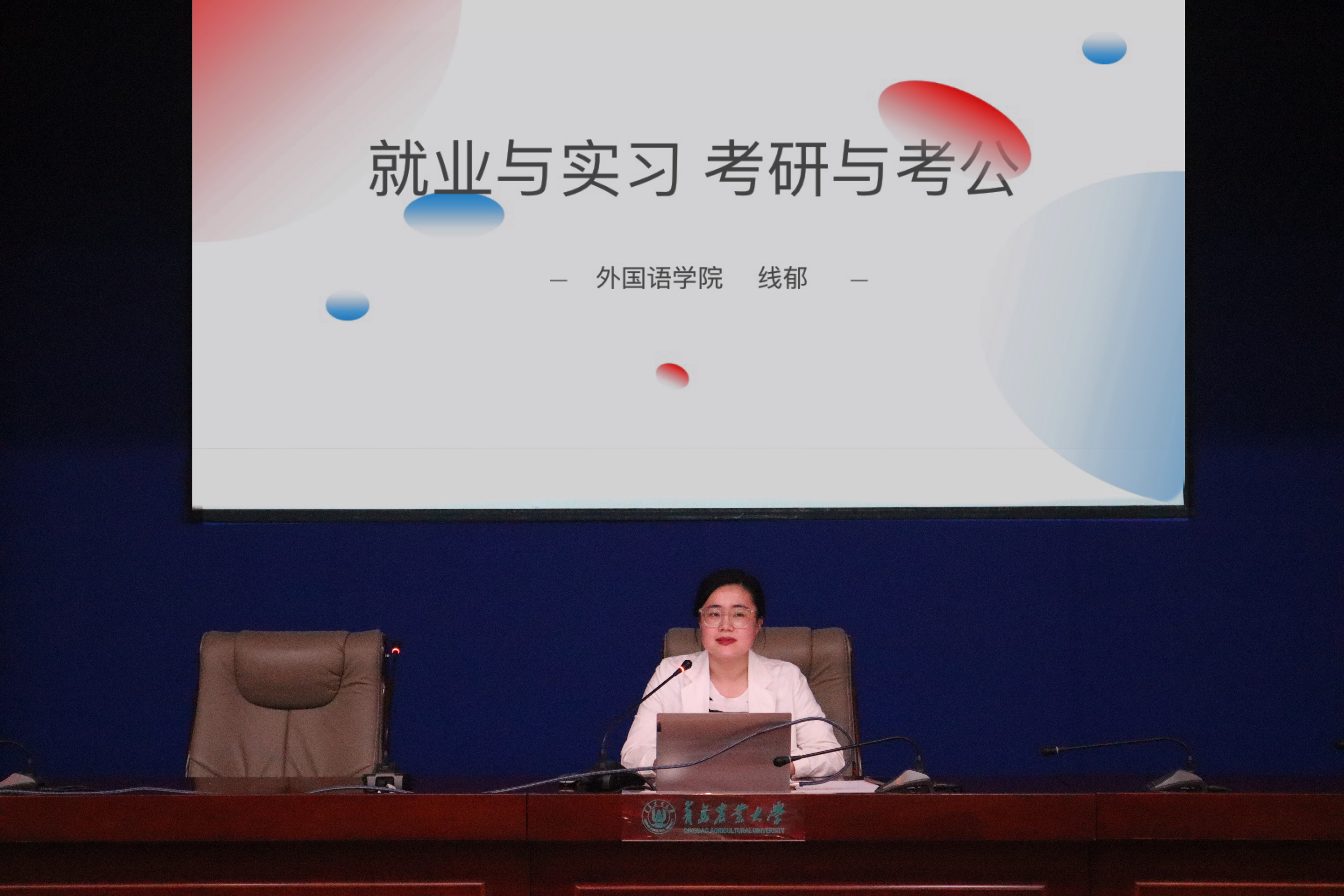 线郁以“就业与实习、考研与考公”为主题,系统分析了当前就业形式,以数据和案例为依据解释了外国语学院毕业生社会需求与人才培养质量综合报告,强调了实习对于就业的重要性。在考研与考公部分,线郁讲解了如何提高个人能力与目标院校的匹配程度,准确搜集目标院校的信息,从而科学选择学校和专业,强调同学们要多通过实习实践锻炼自己的职业胜任力和研究生胜任力,注重综合能力的提升。
