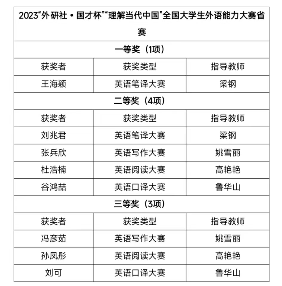 11月4日至5日,2023“外研社•国才杯”“理解当代中国”全国大学生外语能力大赛山东省省赛在山东大学隆重举行。此次大赛共有来自全省76所高校20000余名学生报名参赛,经过激烈角逐,共有729名选手成功晋级省赛,参赛人数、参赛高校数均创历史新高。sunbet申搏官方网站外国语学院学生获得省赛一等奖1项、二等奖4项、三等奖3项。