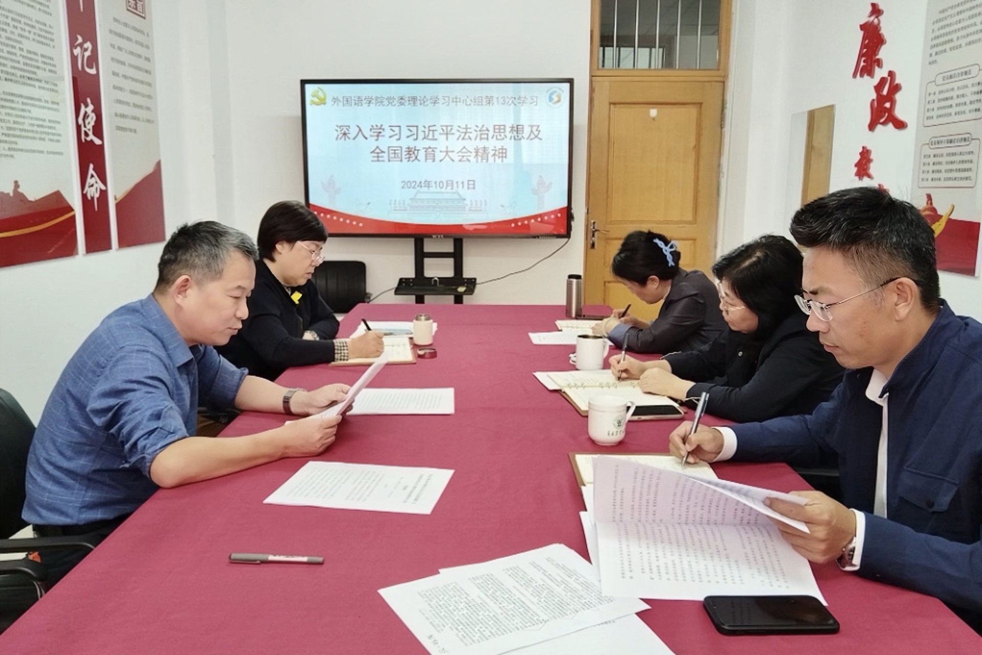 10月11日,外国语学院召开党委理论学习中心组学习,深入学习领会习近平总书记关于法治工作重要指示批示精神及全国教育大会精神。会议由外国语学院党委书记王效仿主持,学院党委班子成员参加。