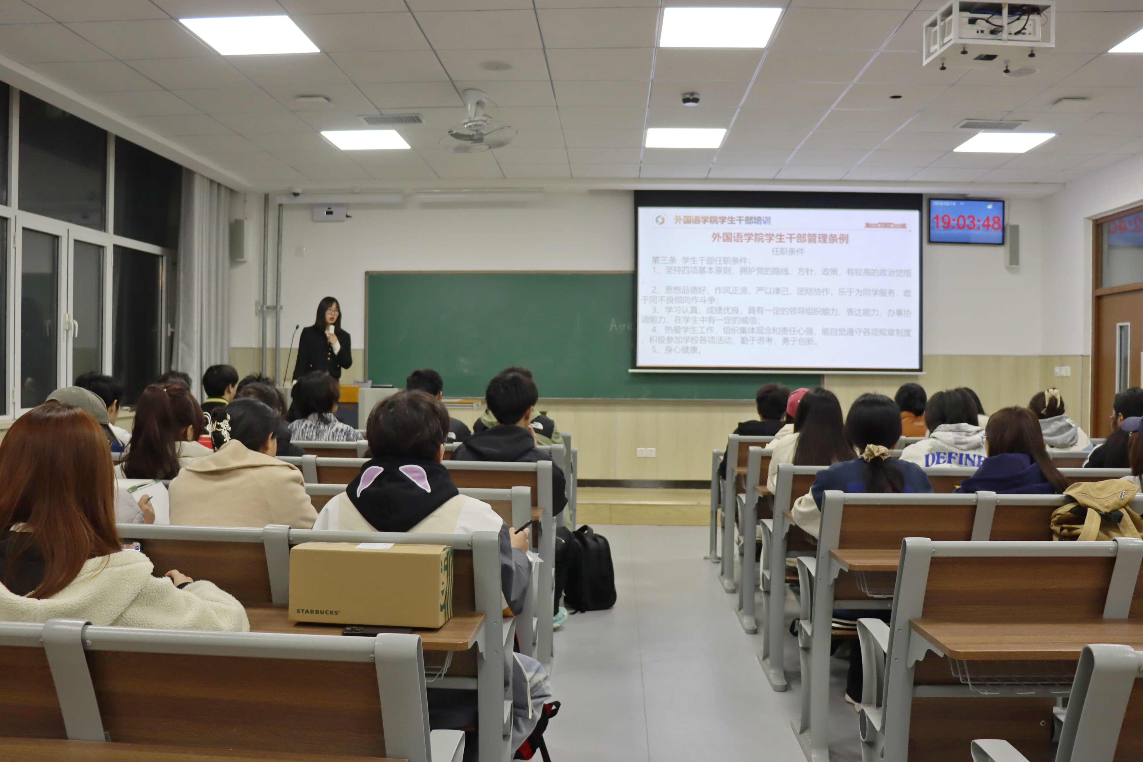 邹晓婷围绕学生干部的角色定位、素质与能力、合理处理内部关系、经典案例分析四个方面开展培训,通过学习《外国语学院学生干部管理条例》,强调作为学生干部的任职条件、权责以及考核奖惩规定等,鼓励学生干部要不断提高自身素质和自我能力,充分发挥学生干部的引领作用,为学院发展建设贡献力量。