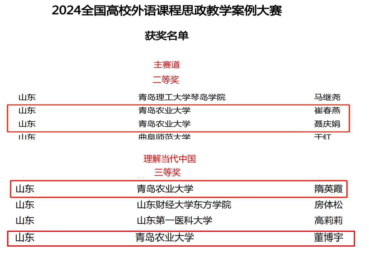 近日,2024年全国高校外语课程思政教学案例大赛评审结果公布,sunbet申搏官网外国语学院教师提交的参赛作品共获得二等奖2项,三等奖2项。其中,大学英语第二教学部聂庆娟、崔春燕老师提交的作品斩获主赛道全国二等奖,英语系董博宇老师和大学英语第一教学部隋英霞老师提交的作品斩获“理解当代中国”赛道三等奖。