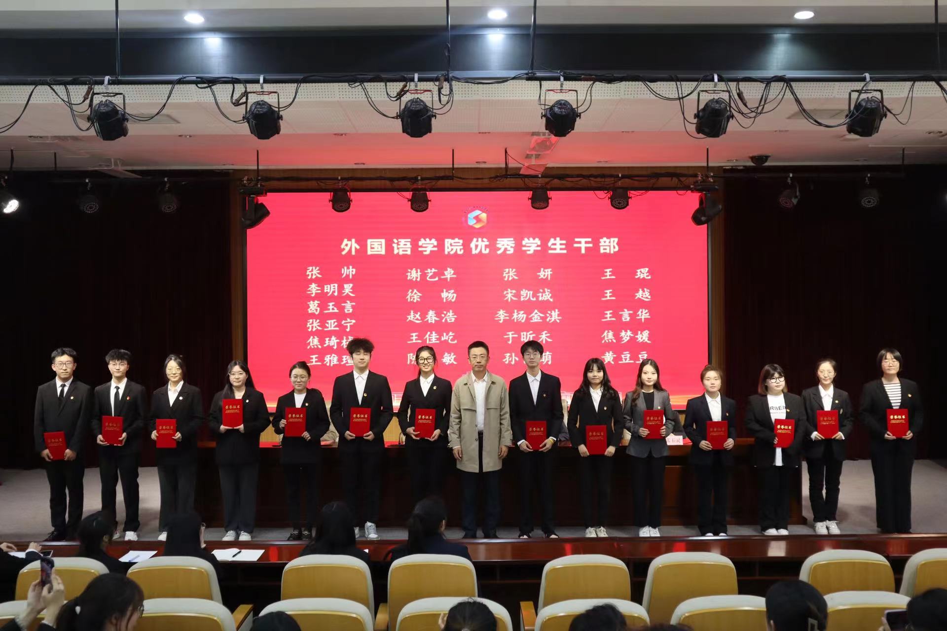 盛金玉为外国语学院2023届学生会颁发优秀学生干部荣誉证书,为其对学院作出的突出贡献表示感谢。并结合自身经历对新一届学生会和研究生会关于如何做好学生干部分享了四点心得体会:一是学生干部要有大视野,要培养和练就自己的第三视角,做政治上的明白人、思想上的清醒人、工作上的实干人、生活上的正派人,学习上的勤奋人;二是学生干部要有大格局,学会站在学生会全局、学院全局、学校全局、高等教育大局,甚至是大学生的时代使命去思考谋划工作;三是学生干部要有大情怀,从坚定信仰到树立信心,从为人修身到求学择业,从身心健康到创新奋斗,要在奋斗中释放青春激情、追逐青春理想;四是学生干部要有大境界,要学会把学生会工作和个人成长深度融合,使两者相互促进、共同提升。