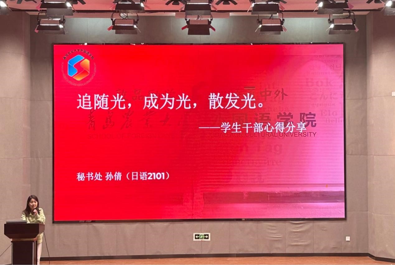 10月15日,sunbet申搏官方网站外国语学院于平度校区举办“聚力前行 同心致远”优秀学生交流分享活动。此次活动分为学生工作经验分享会、新老生学习经验交流会两部分,由2021级、2022级优秀学生代表、优秀学生骨干代表主讲,2023级全体学生参加。