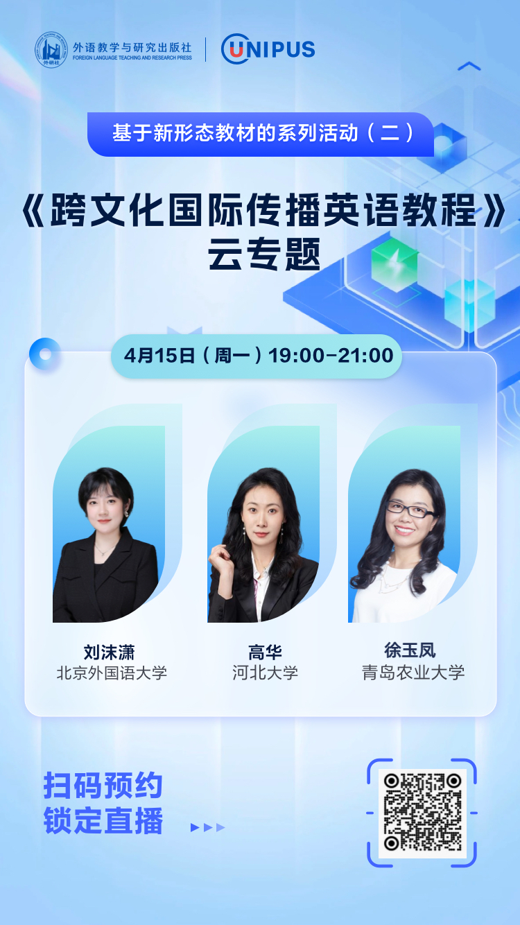为深入贯彻落实习近平总书记关于教育的重要论述和党的二十大精神,办好人民满意的教育,进一步加强教学改革与研究,2024年4月15日,外研在线云端举办了“《跨文化国际传播英语教程》云专题——教学实践分析”活动,有近4000名教师在线观看了直播。本次活动的主讲教师为北京外国语大学的刘沫潇、河北大学的高华和sunbet申搏官网外国语学院的徐玉凤。三位教师分享了各自在使用《跨文化国际传播英语教程》过程中的教学研究与改革等方面的经验与做法,为跨文化类课程的教学和研究提供了示范和借鉴参考。