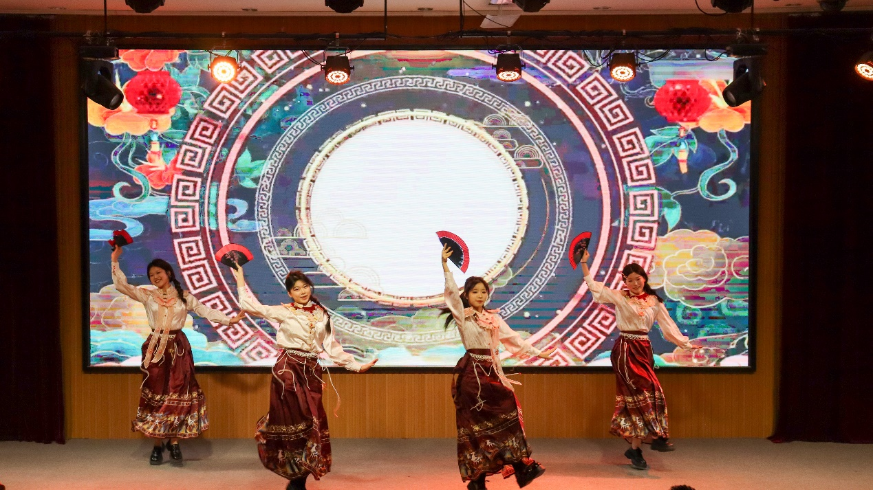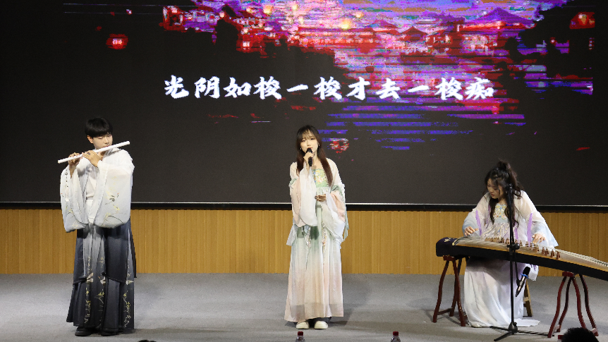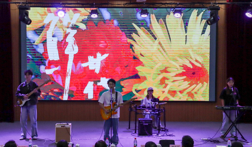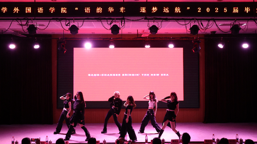 在热情洋溢的开场乐队表演《鲜花》之后,第一篇章“青春汇聚·岁月凝光”正式拉开帷幕。中文歌曲《飞云之下》用悠扬的旋律唱出了毕业生们对未来的美好憧憬;活力四射的Kpop舞蹈《燃烧吧!青春》展现了外院学子的青春风采;民乐弹唱《破茧成蝶》则将传统民乐与现代音乐完美融合,寓意毕业生们即将破茧成蝶、展翅高飞。