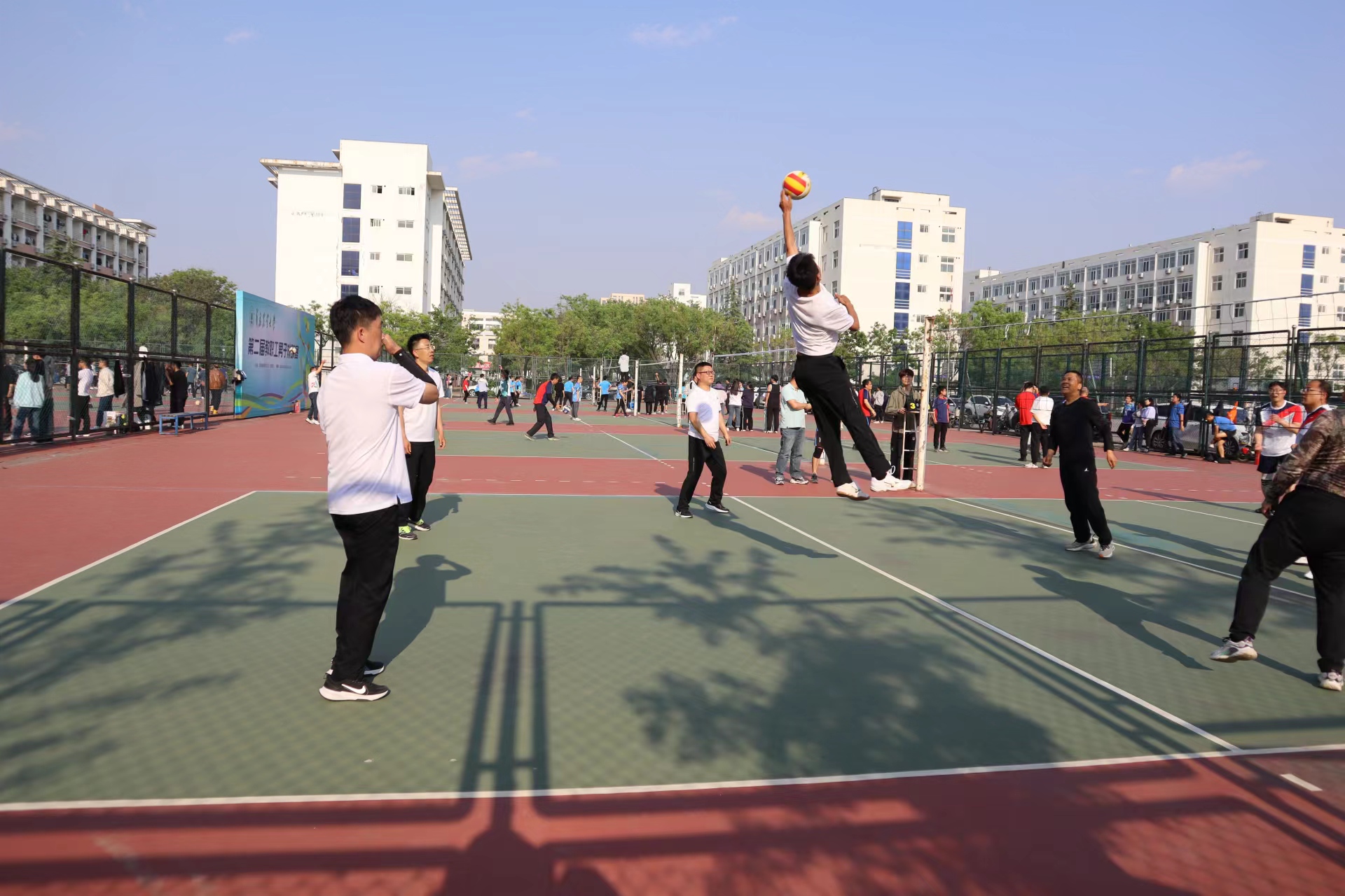 在赛场上,老师们不断调整战术,互相鼓励、默契配合,每一次精彩的扣球、巧妙的拦网都赢得了观众的叫好。比赛不仅增进了教职工之间的交流,也展示了他们积极向上的精神风貌。
