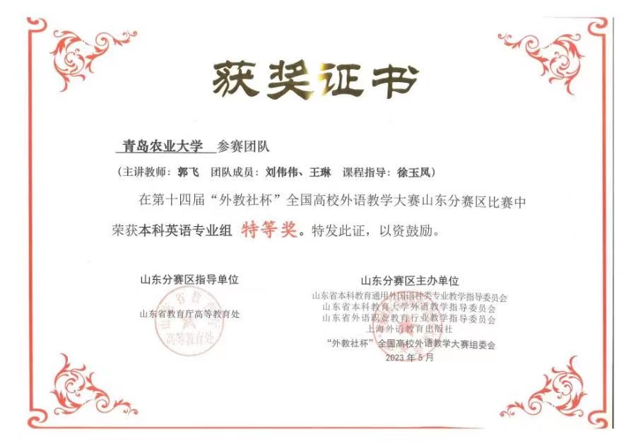 郭飞团队荣获“外教社杯”全国高校外语教学大赛山东赛区特等奖