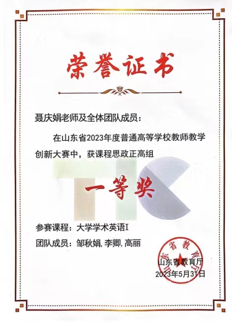 聂庆娟团队参加2023年山东省高校教师教学创新大赛,获课程思政正高组一等奖