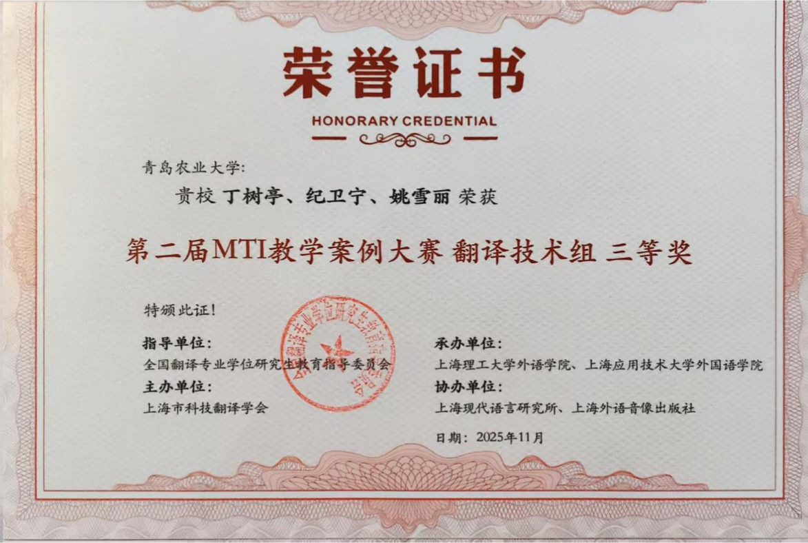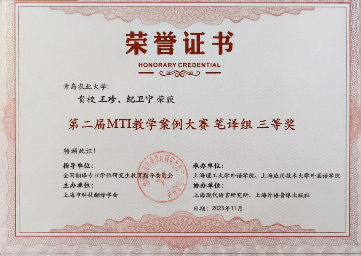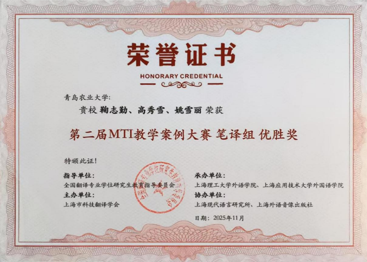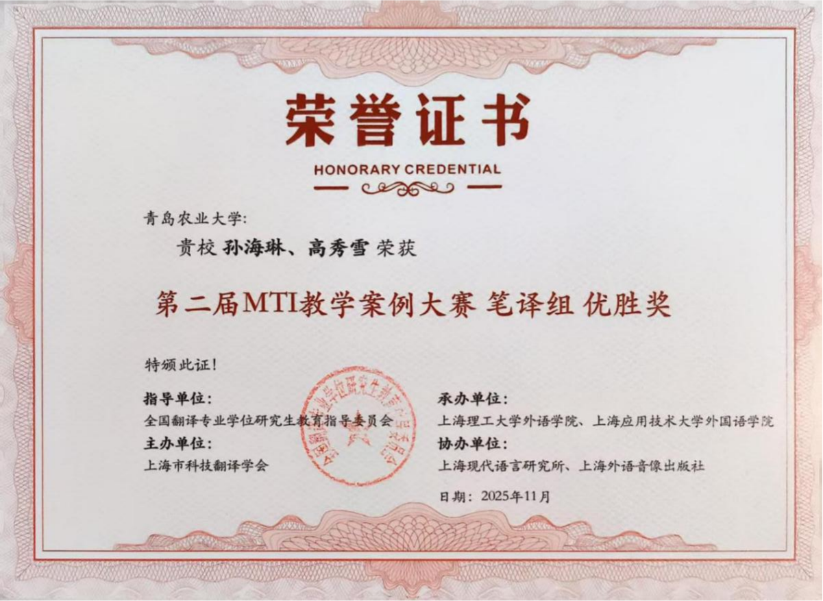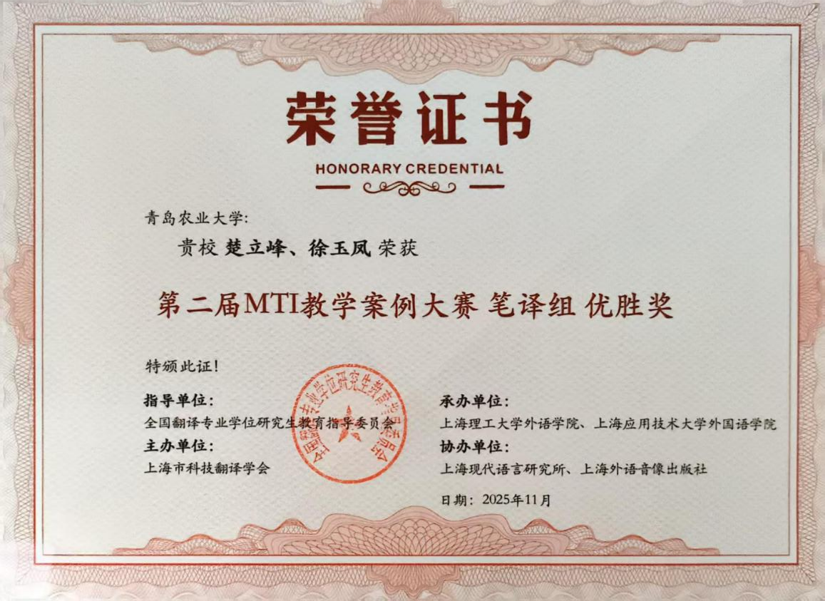 大赛共设笔译、口译、翻译技术、翻译项目管理四个组别,吸引了来自全国122所院校的227份教学案例参赛。经过多轮专家评审,最终评选出一、二、三等奖及优胜奖。我院教师王珍团队的《中国农业特色文化翻译实践中的理解与表达》获笔译组三等奖,丁树亭团队的《筑基农学术语标准,擎画战略兴农新程》获翻译技术组三等奖。鞠志勤团队的《农业科技英语名词化结构的翻译与译后编辑》、孙海琳团队的《天下兴亡,译夫有责一一我国翻译史上的原本选择》以及楚立峰团队的《笔译理论与技巧》获笔译组优胜奖。此次比赛sunbet申搏官网积极组织多支参赛队伍,且表现优异,主办方特颁发优秀组织奖。