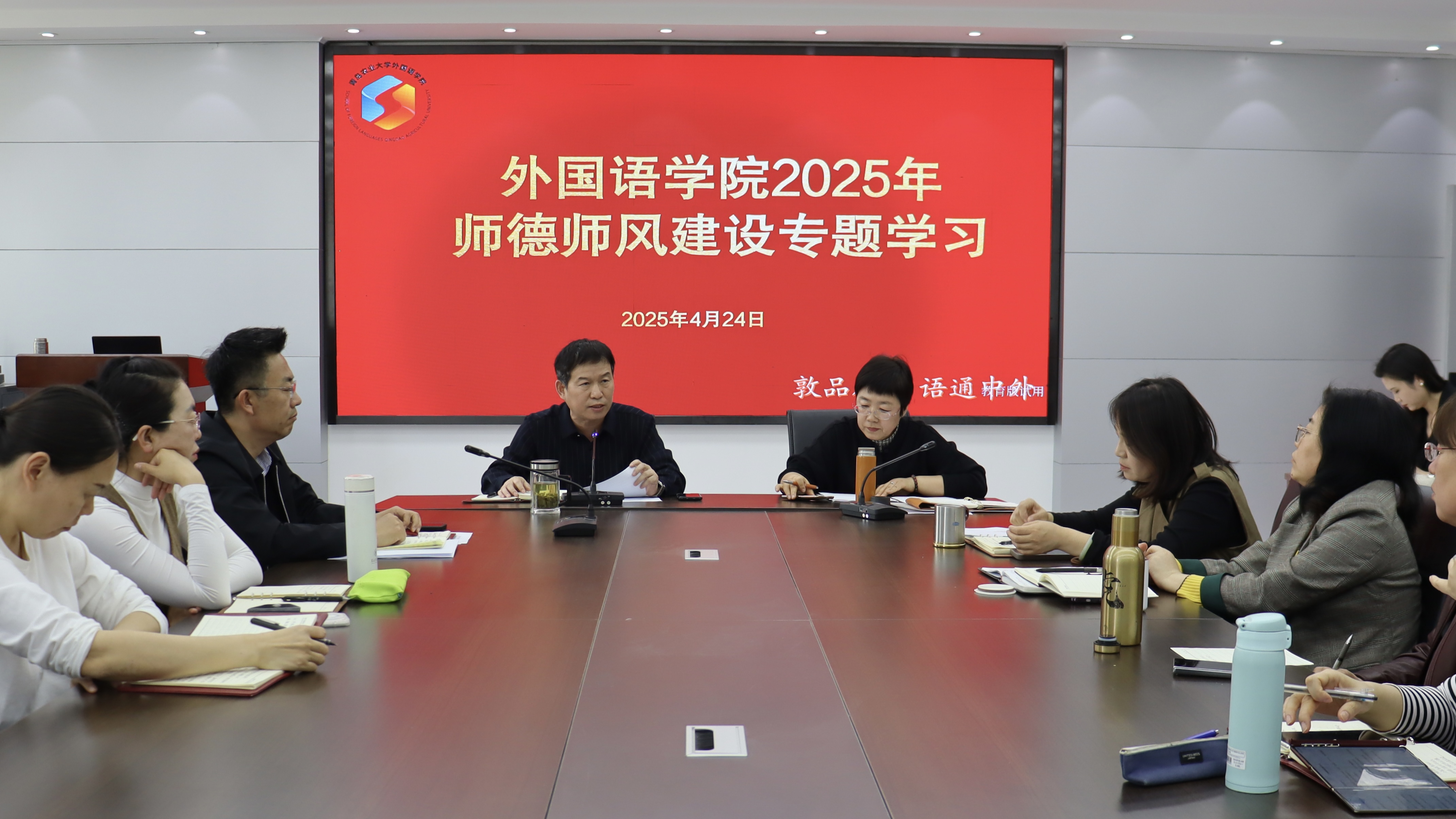 4月24日,外国语学院在文经楼C220组织2025年教职工师德师风建设专题学习,本次会议由外国语学院党委书记王效仿主持,全体教职工参加。