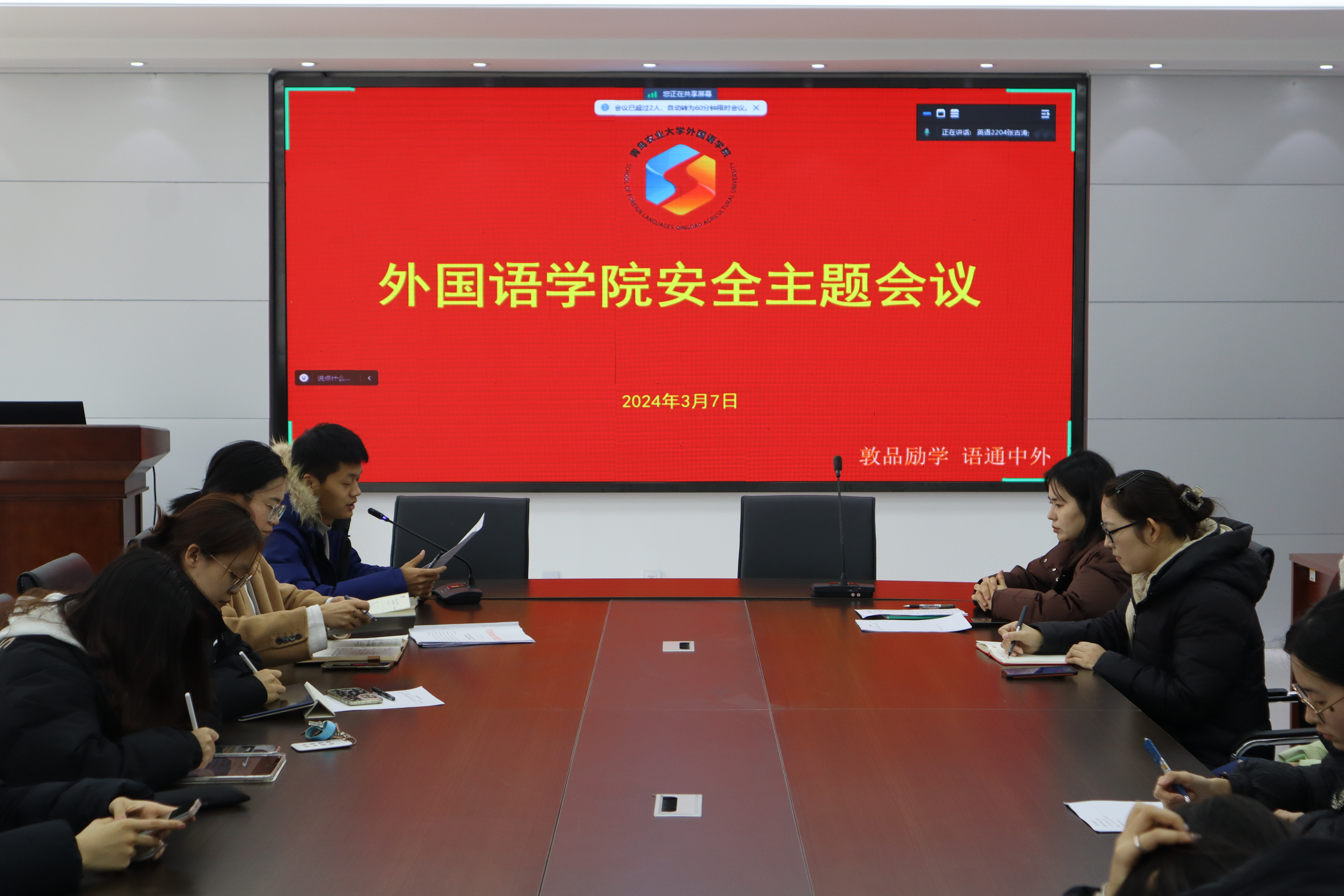 3月7日,sunbet申搏官方网站外国语学院于文经楼C220召开学生安全工作主题会议,本次会议由外国语学院辅导员王洋洋主持,外国语学院团委书记线郁、辅导员仇文峰、张玉灵出席,全体学生干部参加。